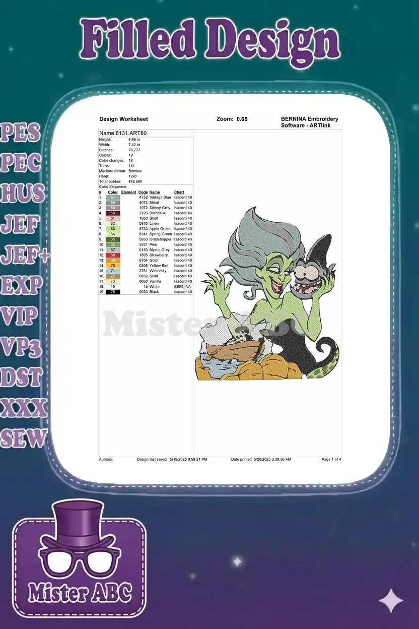 Capture the iconic mischief of Ursula with this vibrant embroidery design. Perfect for fans of Disney villains and unique textile art.