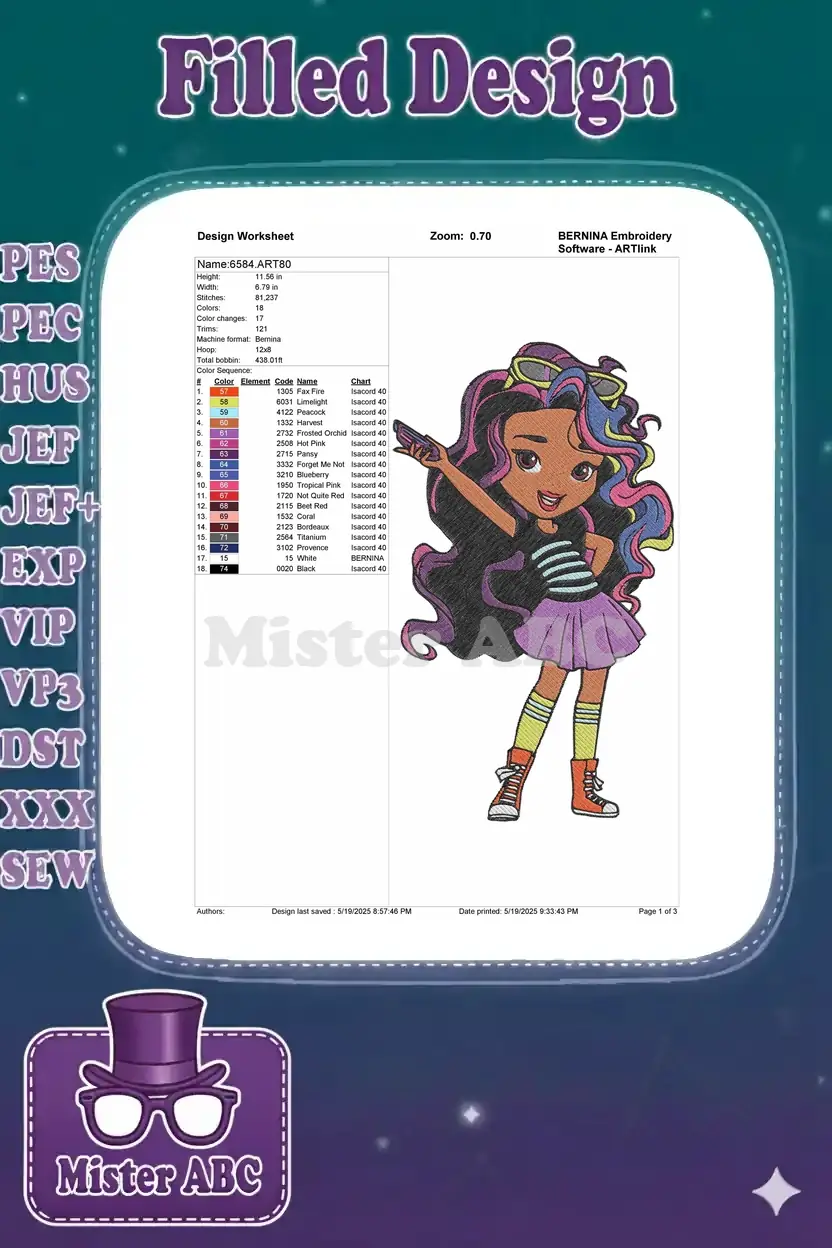 Vibrant cartoon girl with colorful hair sunglasses and stylish outfit embroidery designs
