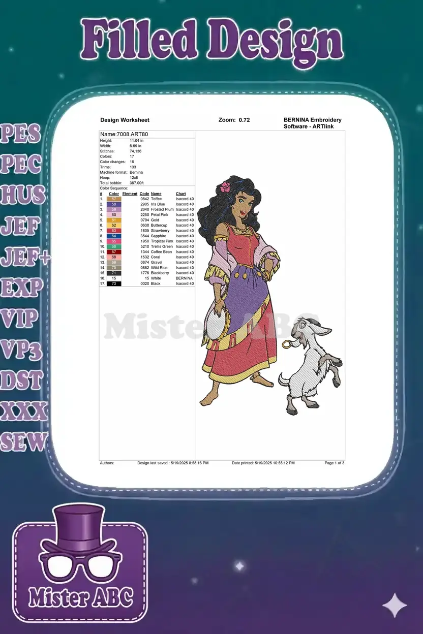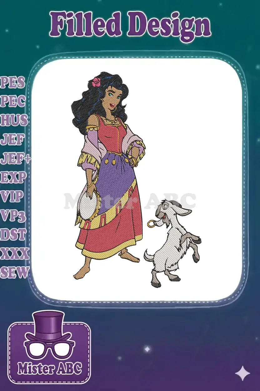 Vibrant Esmeralda with Djali the goat Disney Hunchback embroidery designs