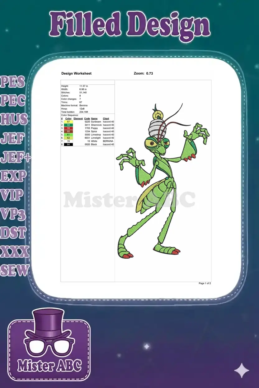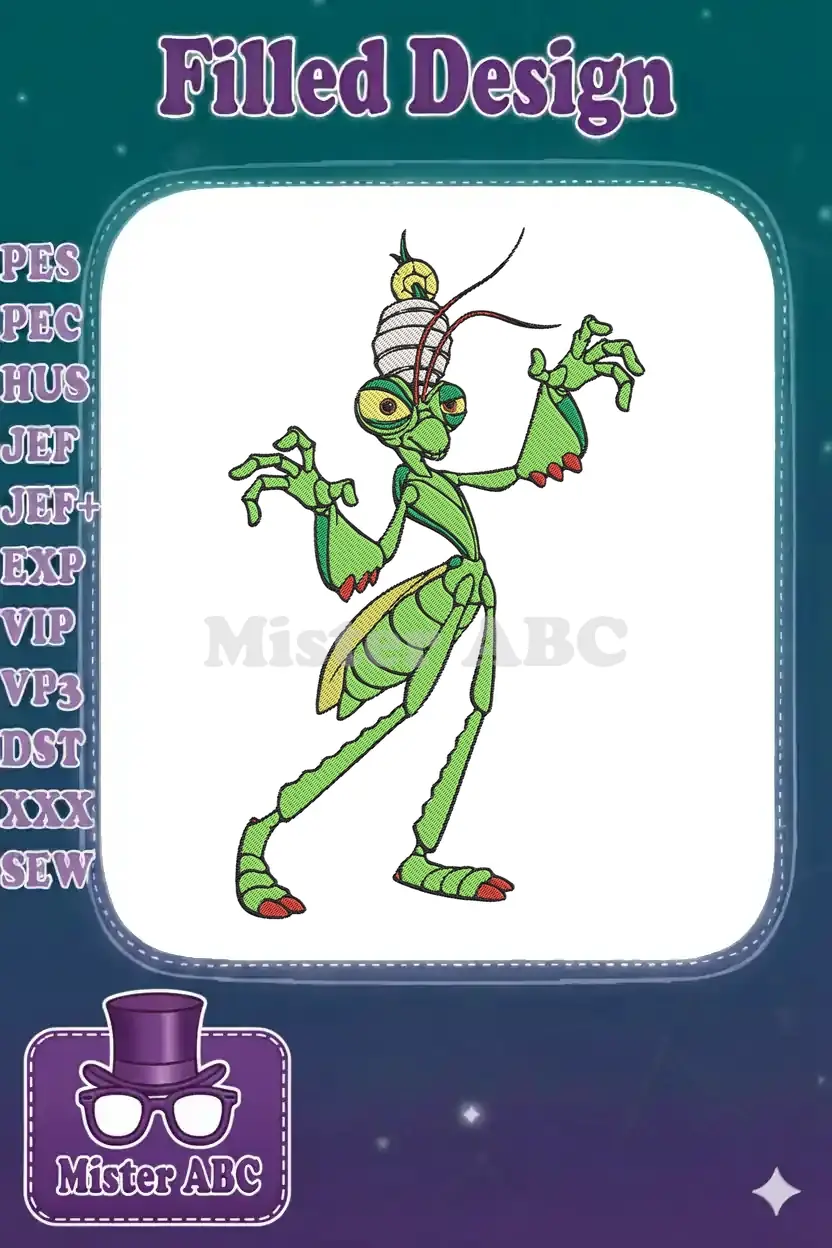 Vibrant Green Cartoon Praying Mantis Insect Embroidery Designs