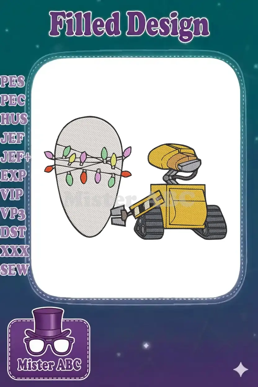 WALL-E robot holding festive oval Christmas lights embroidery designs