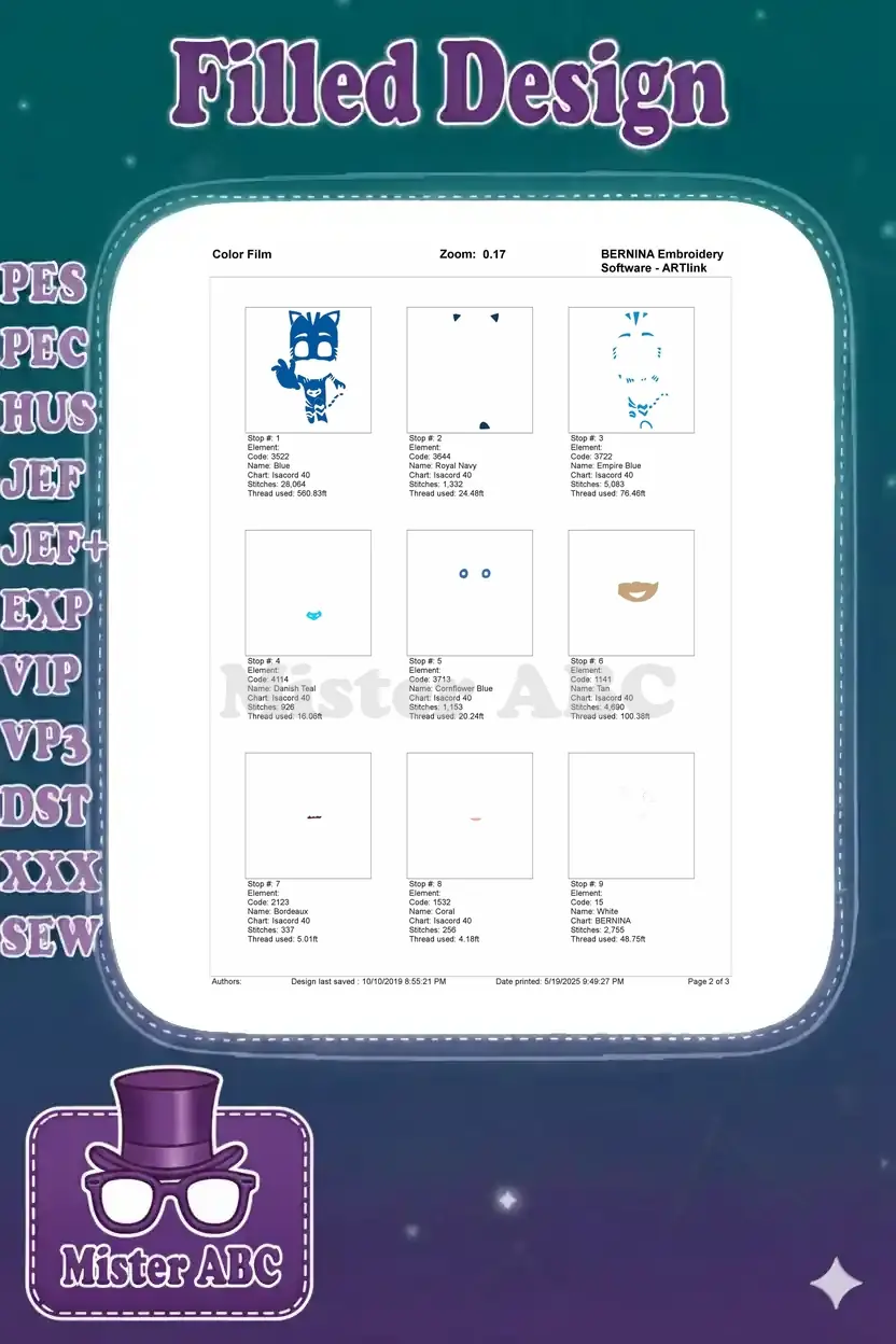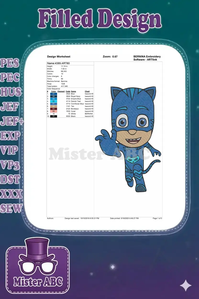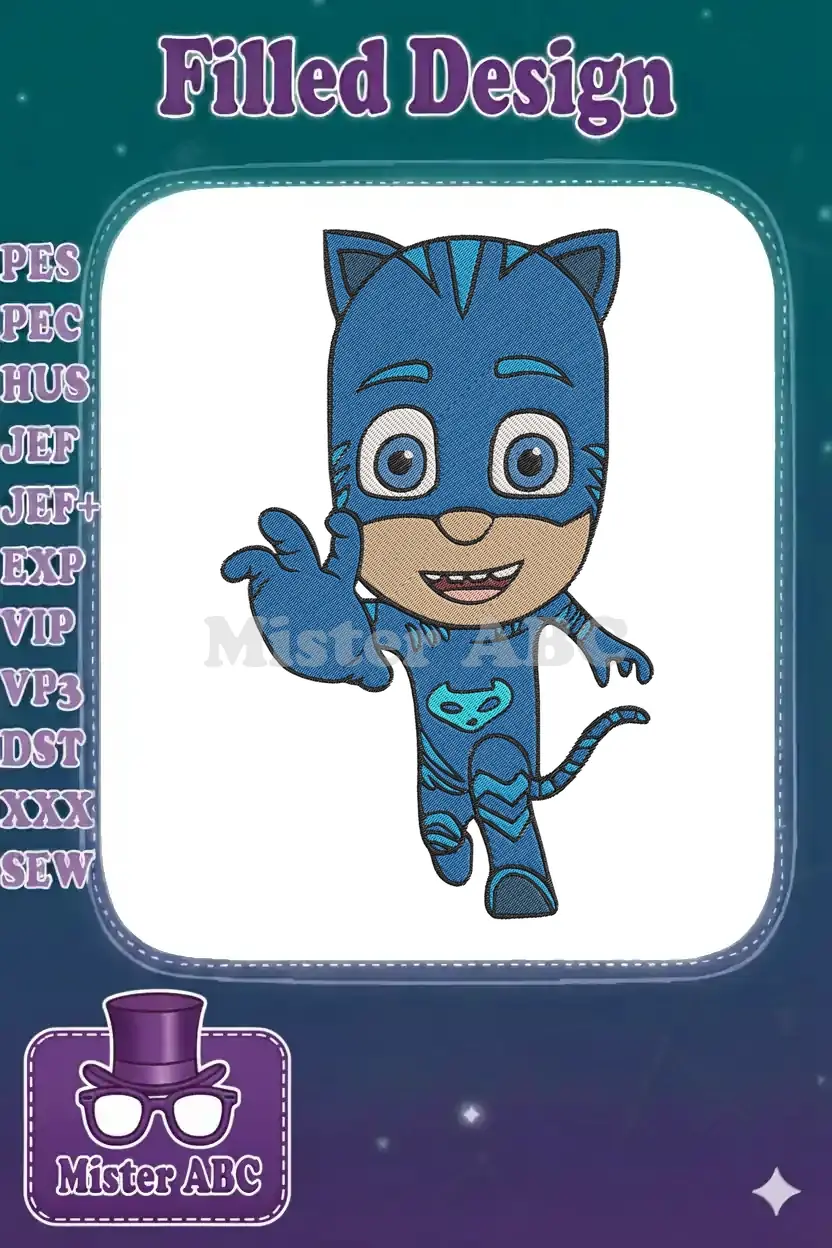 Waving Catboy PJ Masks cartoon superhero embroidery designs for kids