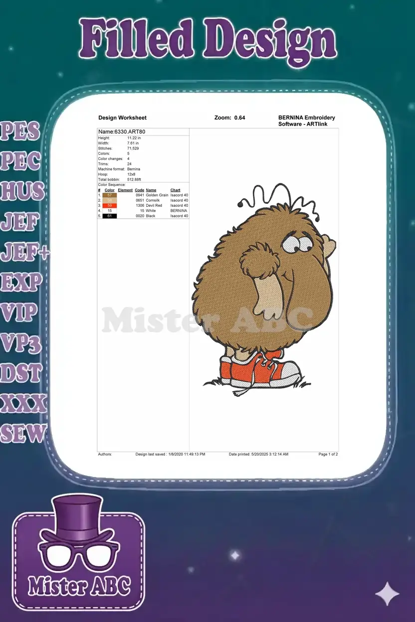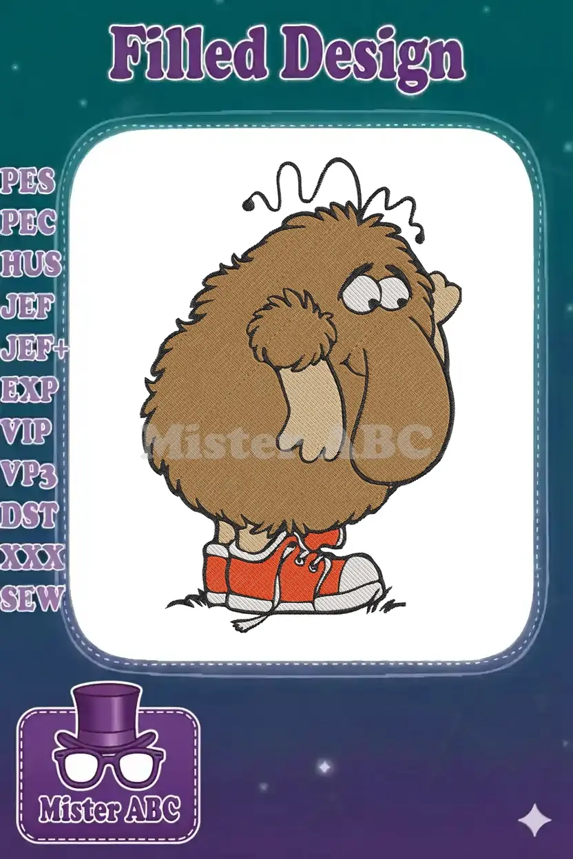 Whimsical brown fluffy monster wearing red sneakers embroidery designs