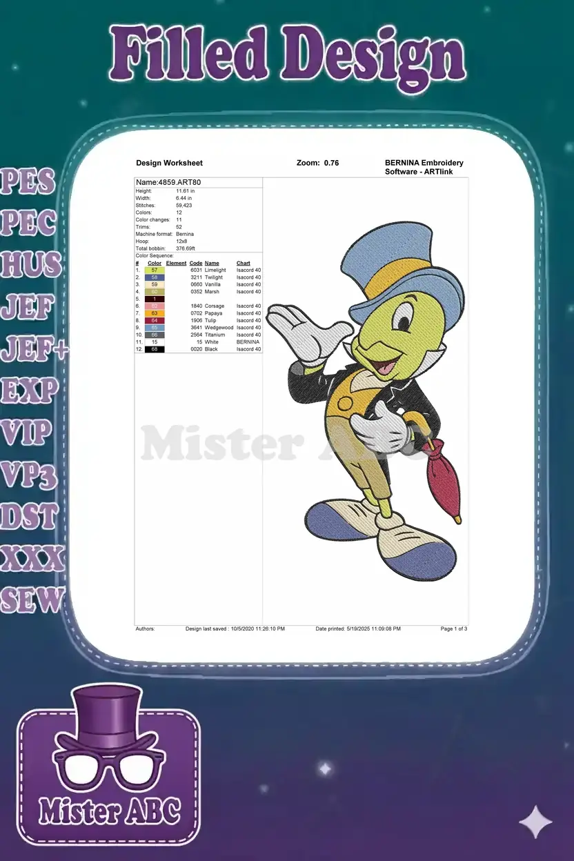 Embrace the charm of Disney’s Jiminy Cricket with this meticulously crafted embroidery design. Perfect for adding a touch of classic whimsy to any project.