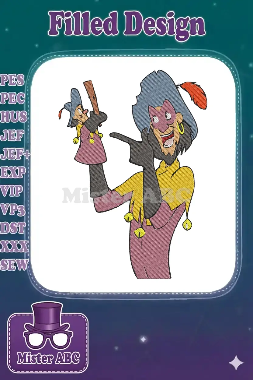 Whimsical jester character holding puppet embroidery designs