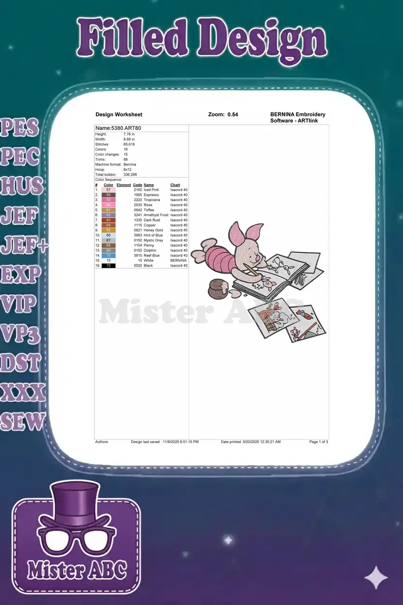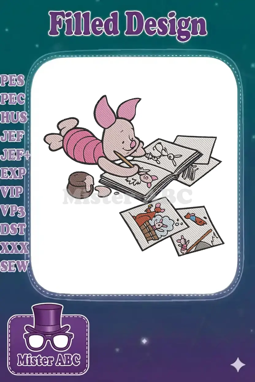Whimsical Piglet creating drawings of Winnie the Pooh characters embroidery designs