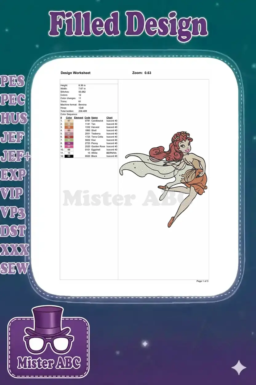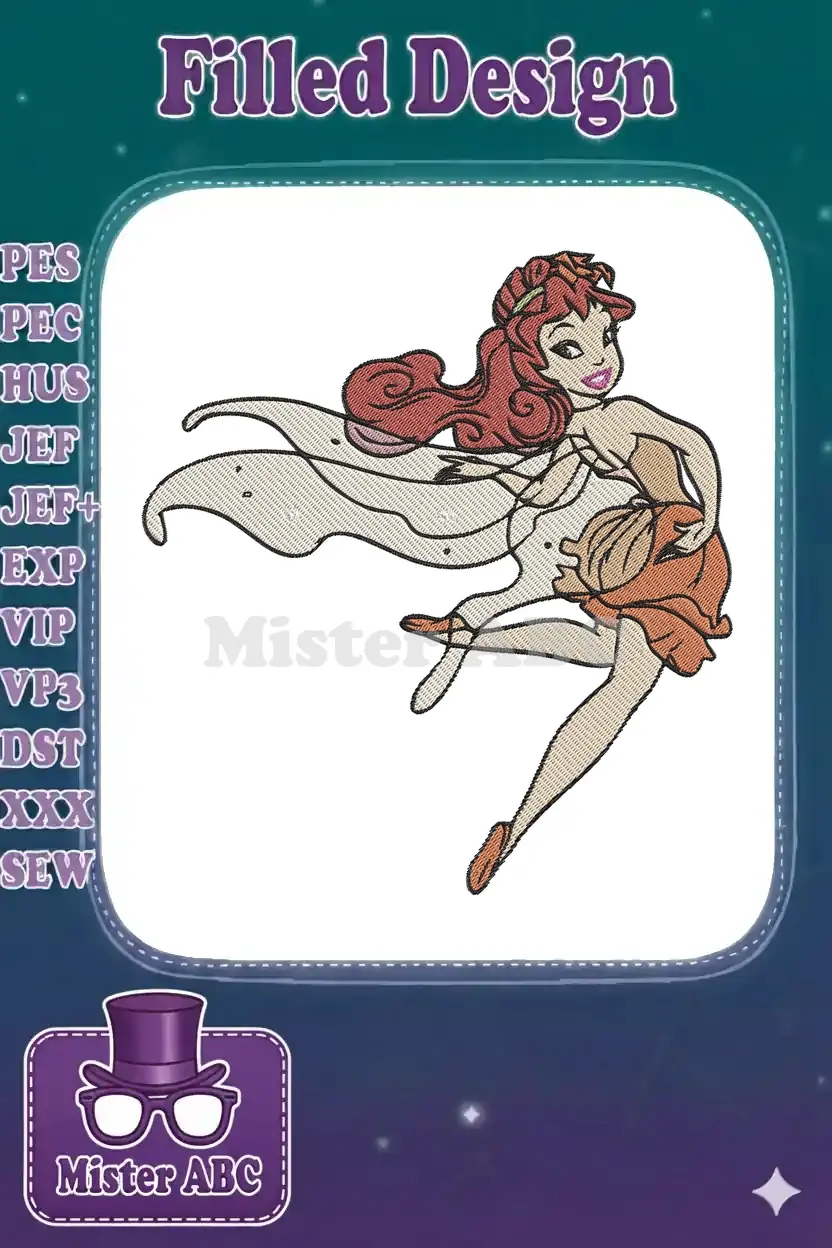 Whimsical red-haired fairy princess with flowing cape embroidery designs
