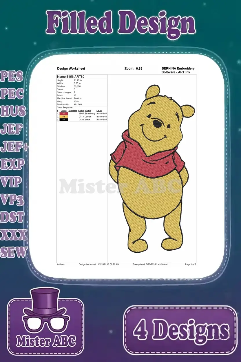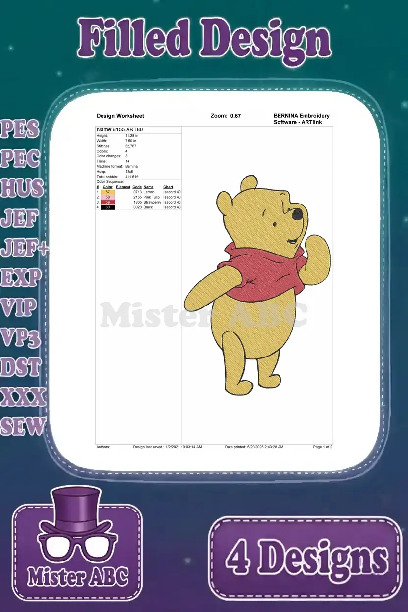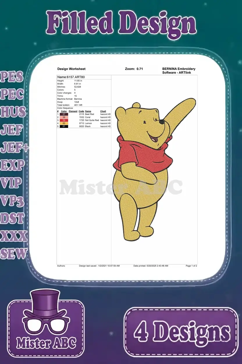 Winnie The Pooh Bear – Assorted Standing Waving Looking Up Happy Poses – Cheerful Pooh Bear Character – Filled Embroidery Design