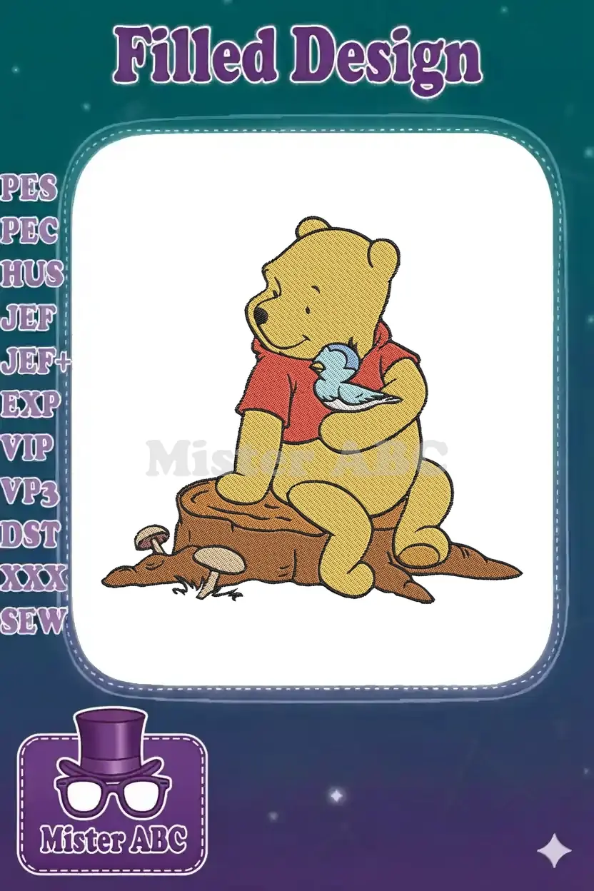Winnie the Pooh Bear with Blue Bird on Stump Embroidery Designs