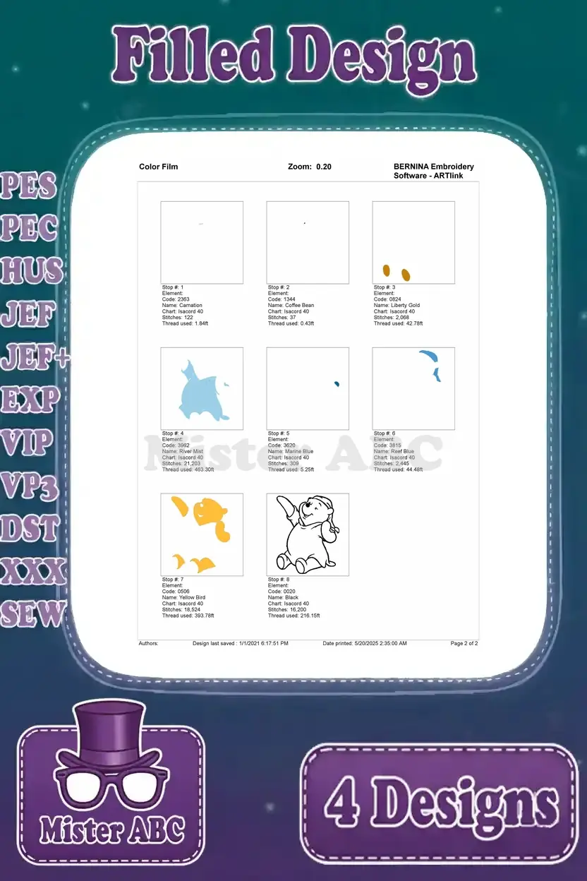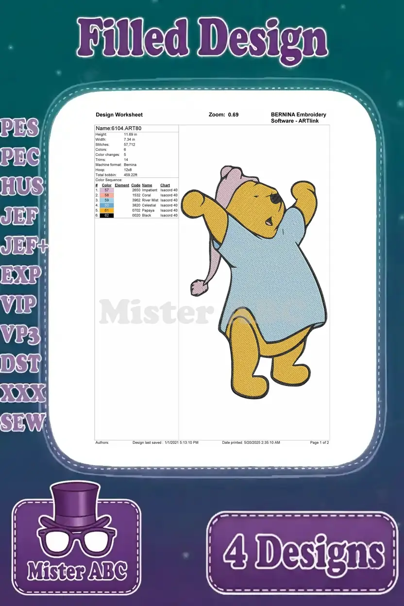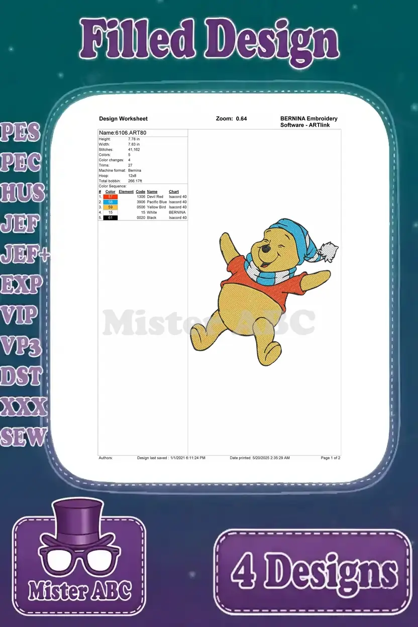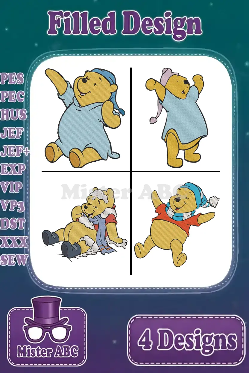Winnie The Pooh Bear Blue Pajamas And Various Winter Outfits Waving Dancing – Filled Embroidery Design