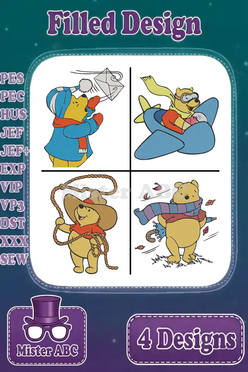Winnie The Pooh Bear Costumes Donald Duck Pilot Cowboy And Winter Skiing Fun – Filled Embroidery Design