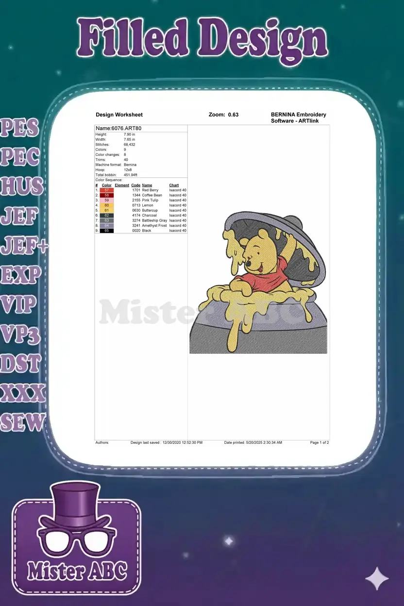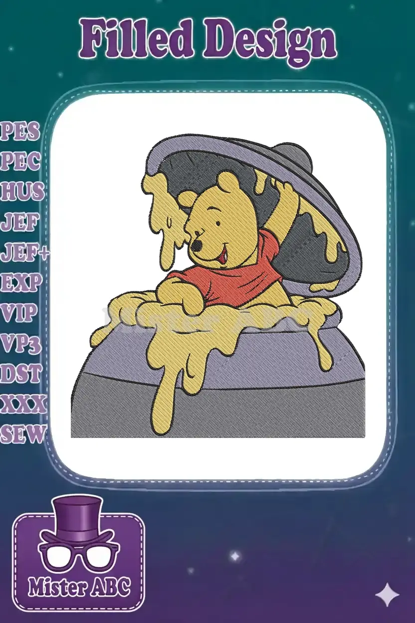 Delightful Winnie the Pooh embroidery design featuring him happily emerging from a honey pot, covered in golden honey. Perfect for fans!