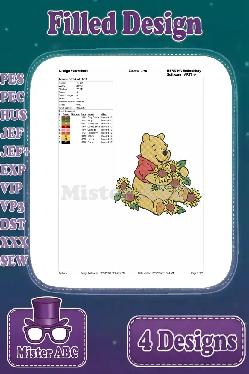 Winnie The Pooh Bear With Flower Fishing Autumn Leaves And Sunflowers – Filled Embroidery Design