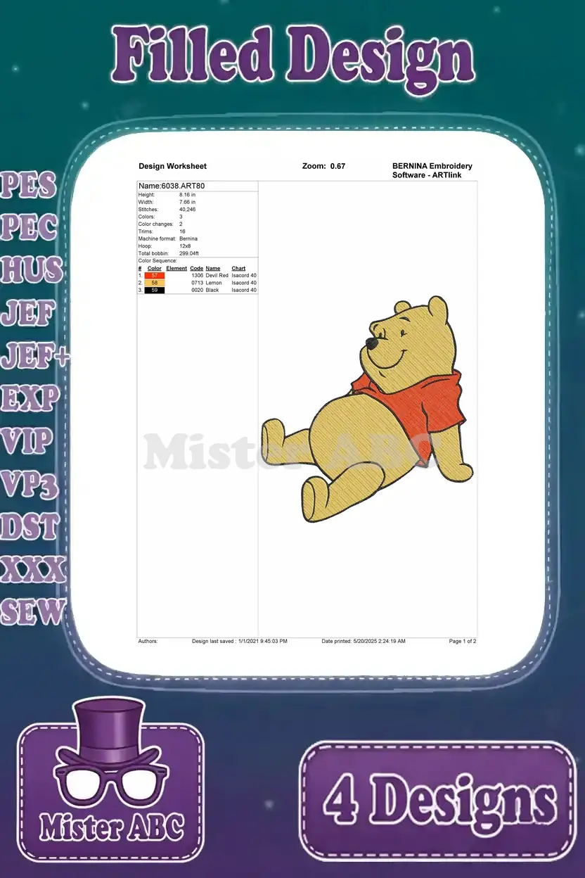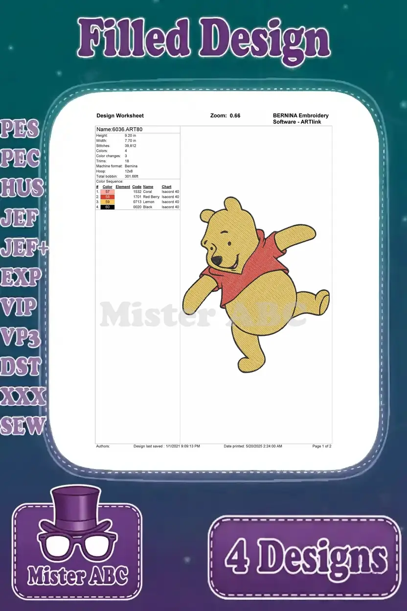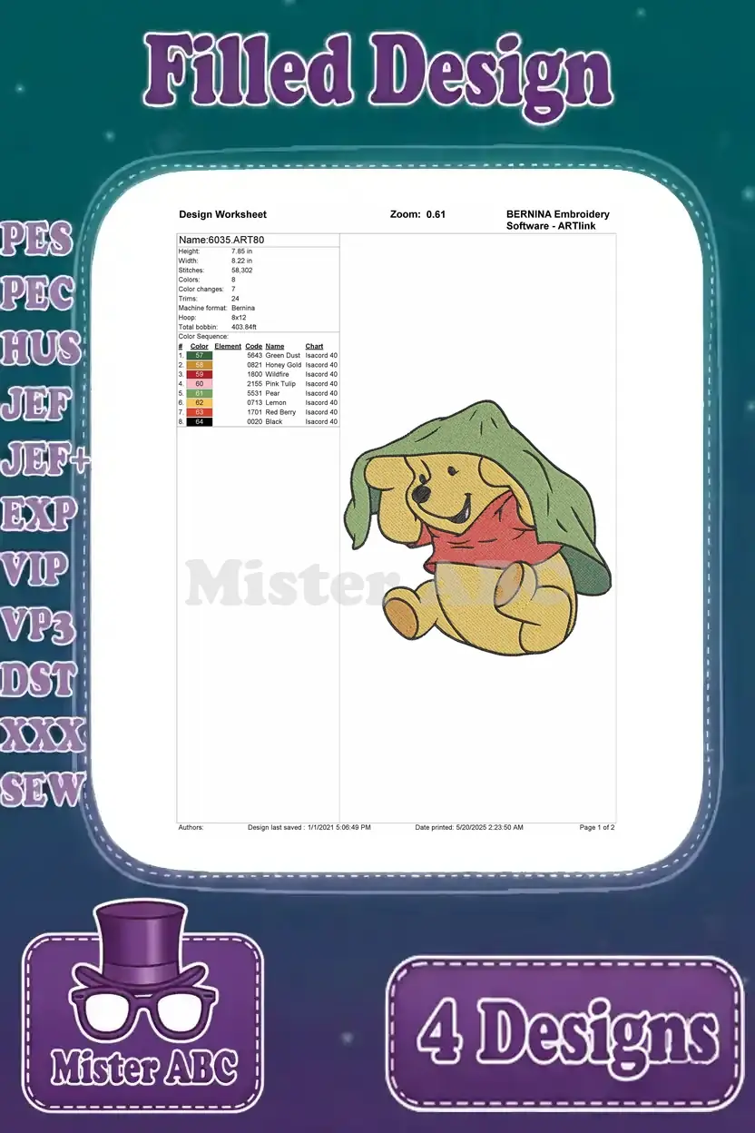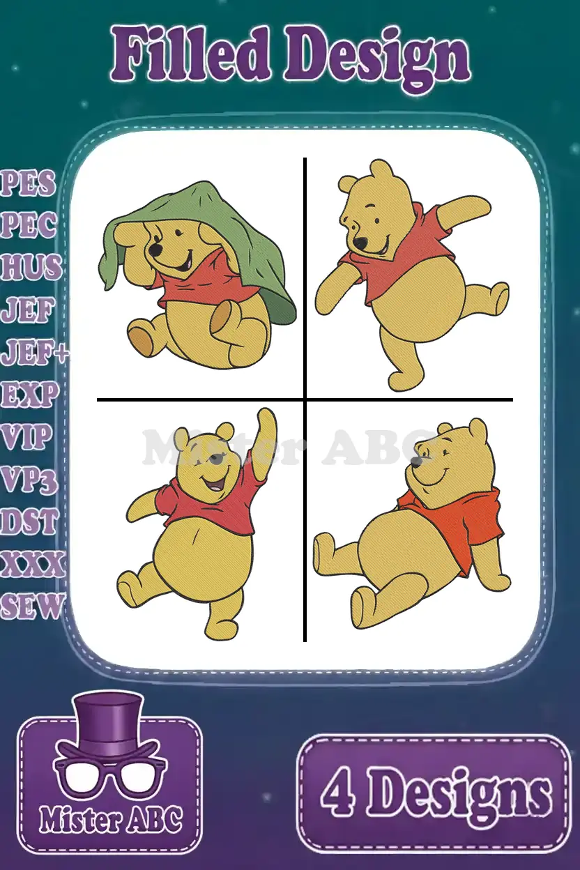Winnie The Pooh Bear With Green Hat Blanket Dancing Happy And Sitting Poses – Filled Embroidery Design