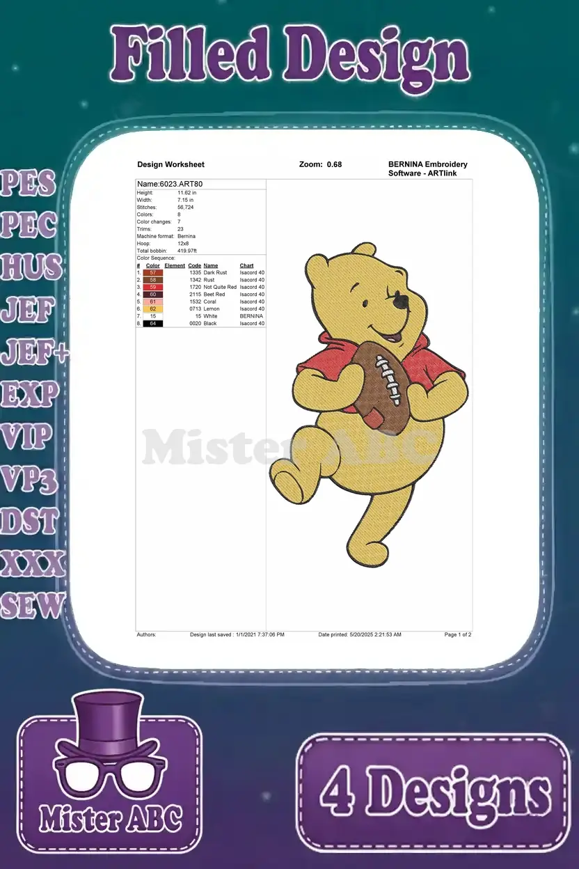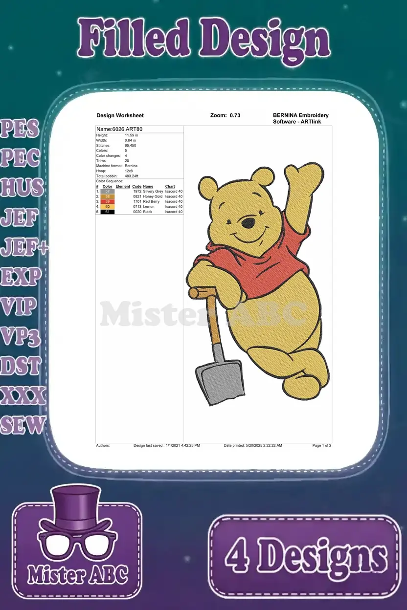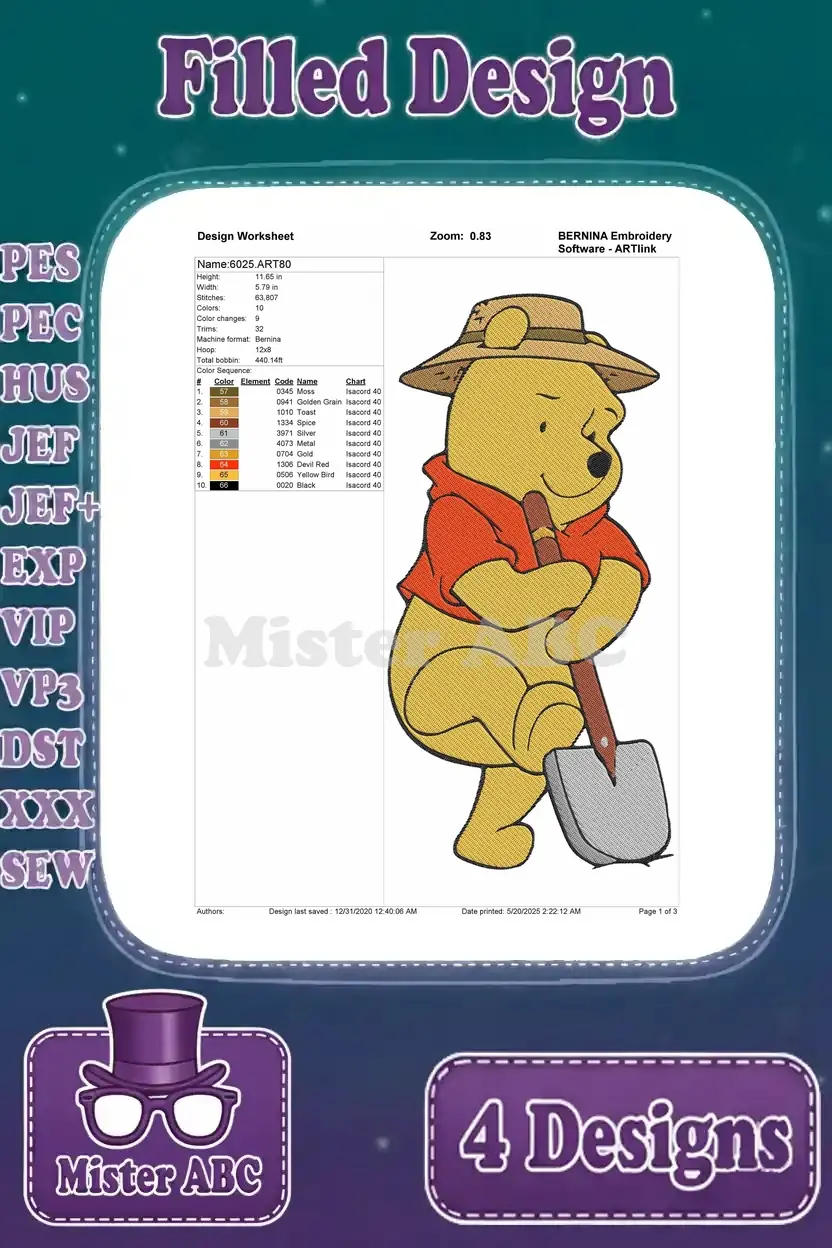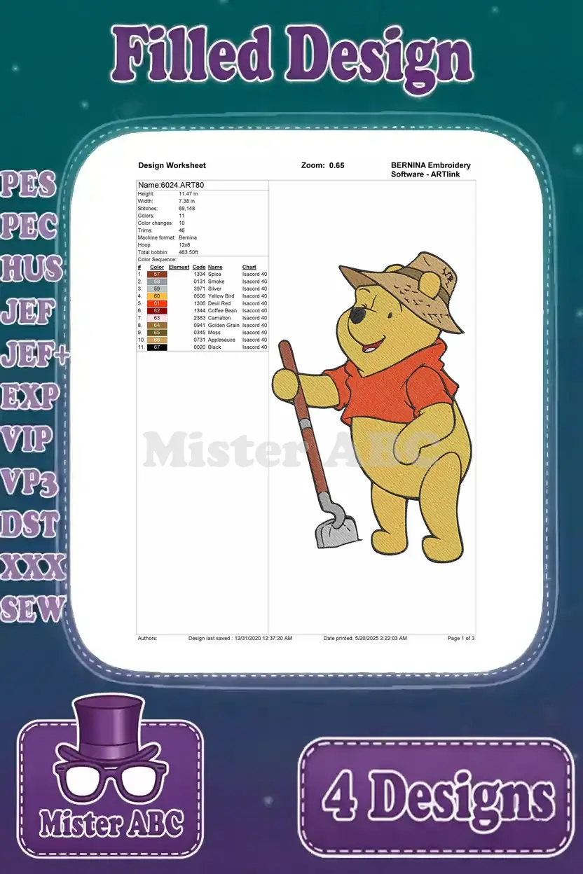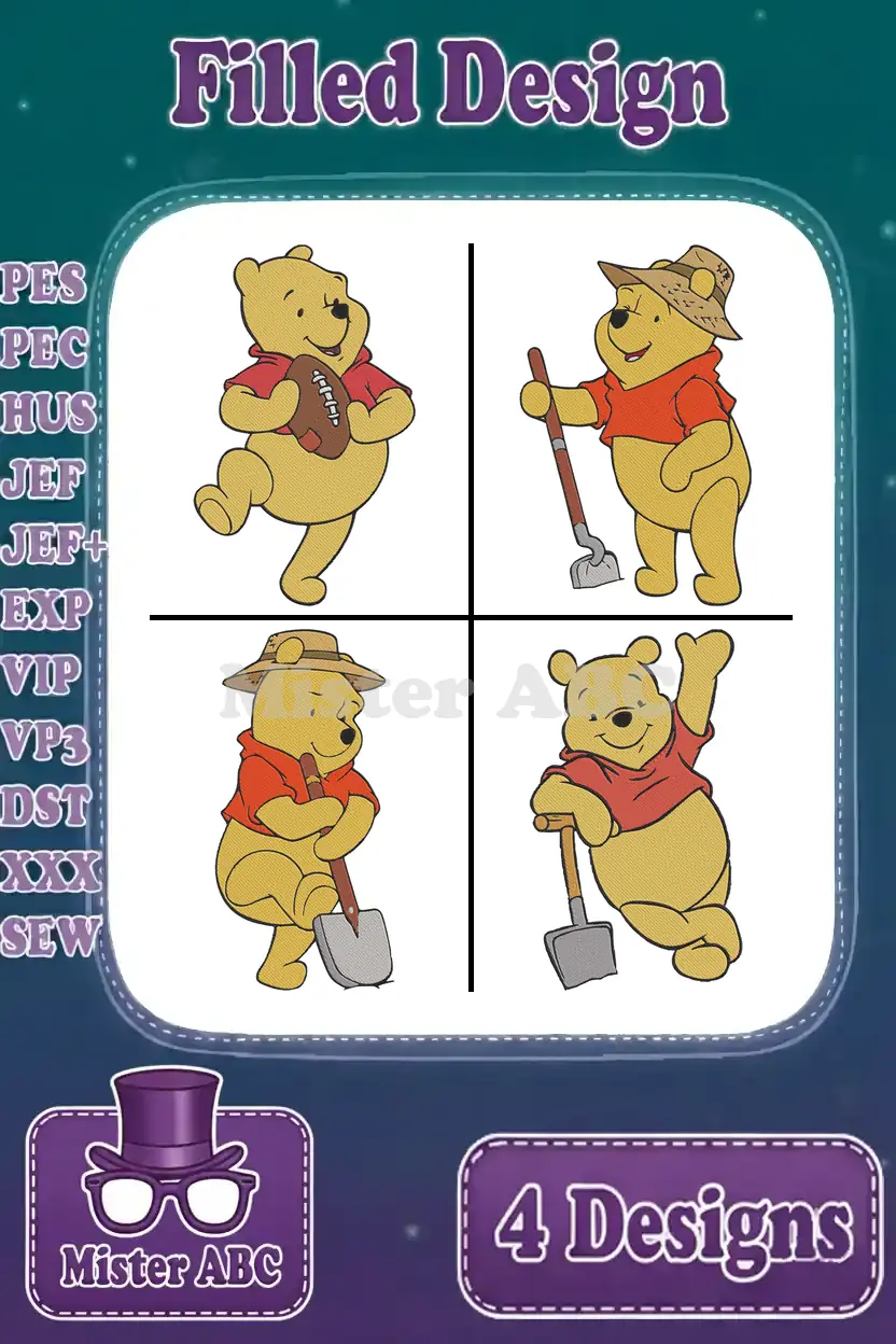 Winnie The Pooh Bear With Honey Pot And As Farmer With Shovel Various Poses – Filled Embroidery Design