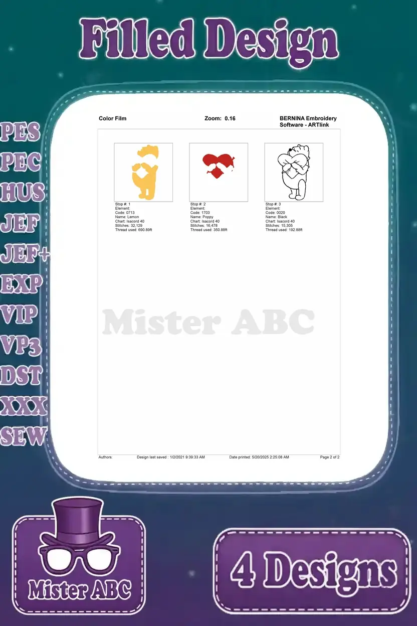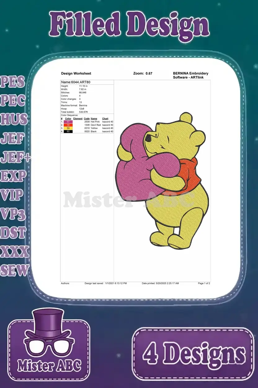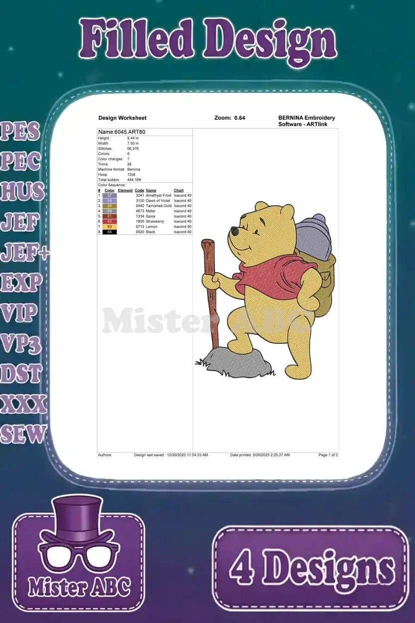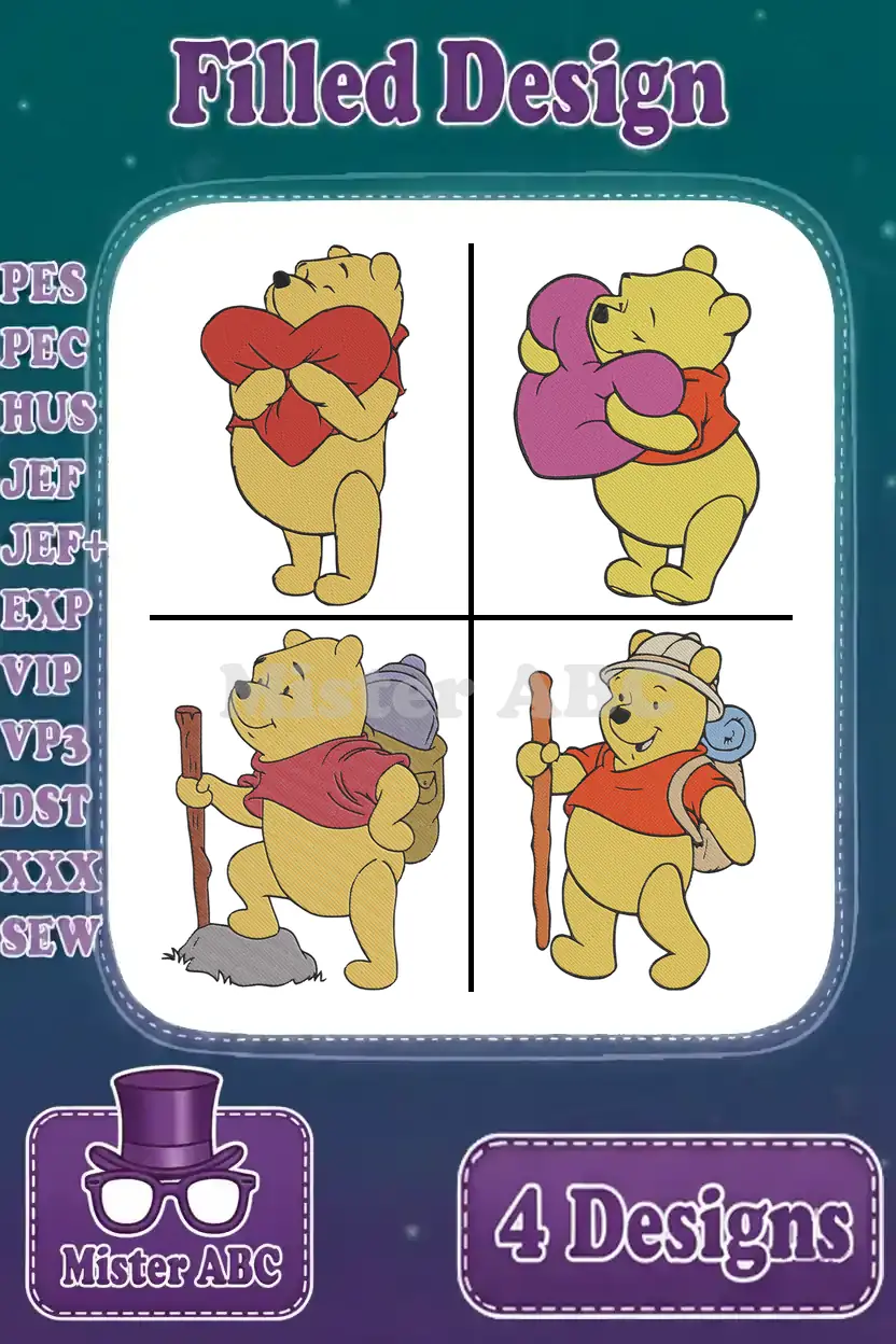 Winnie The Pooh Bear Hugging He With Number Two And Hiking Adventure Poses – Filled Embroidery Design