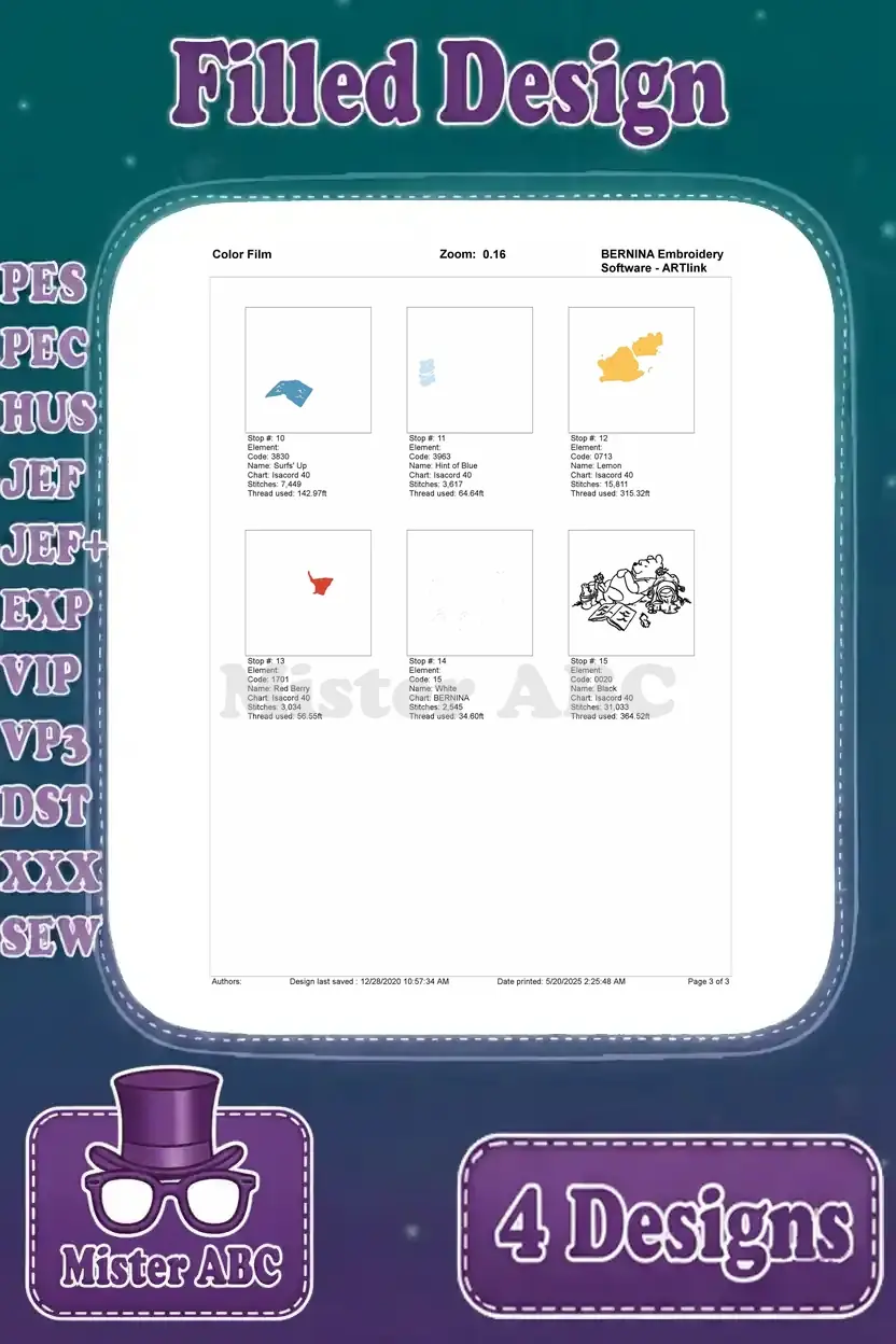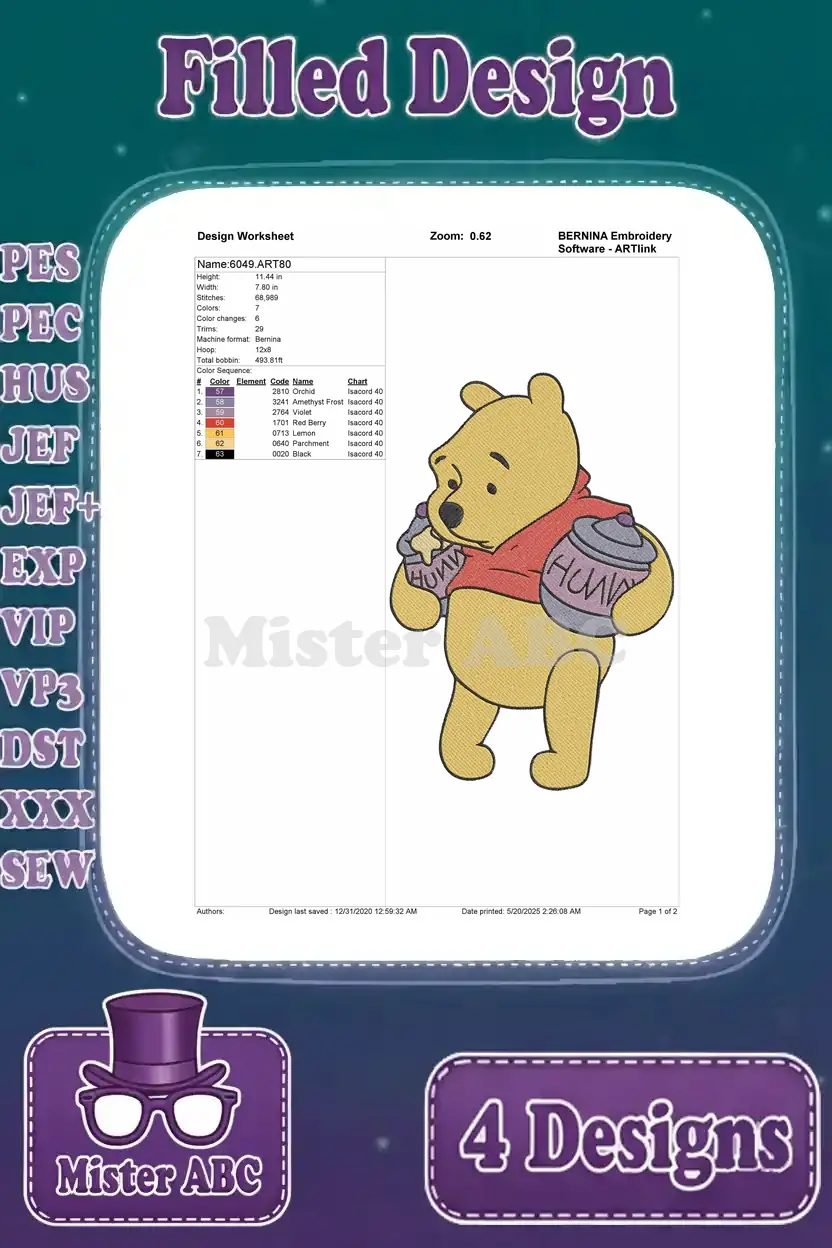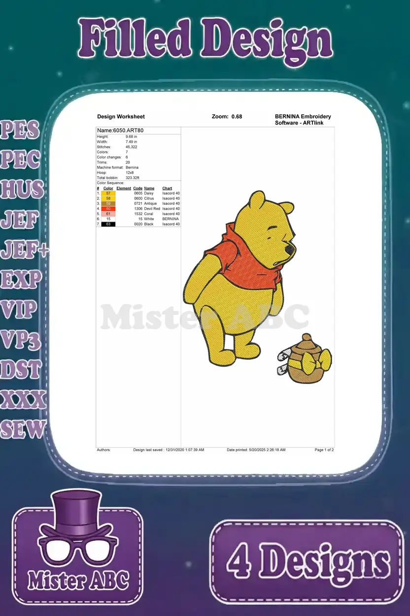 A delightful Winnie the Pooh embroidery bundle featuring four charming filled designs for all crafters. Perfect for adding a touch of Hundred Acre Wood magic to any project!