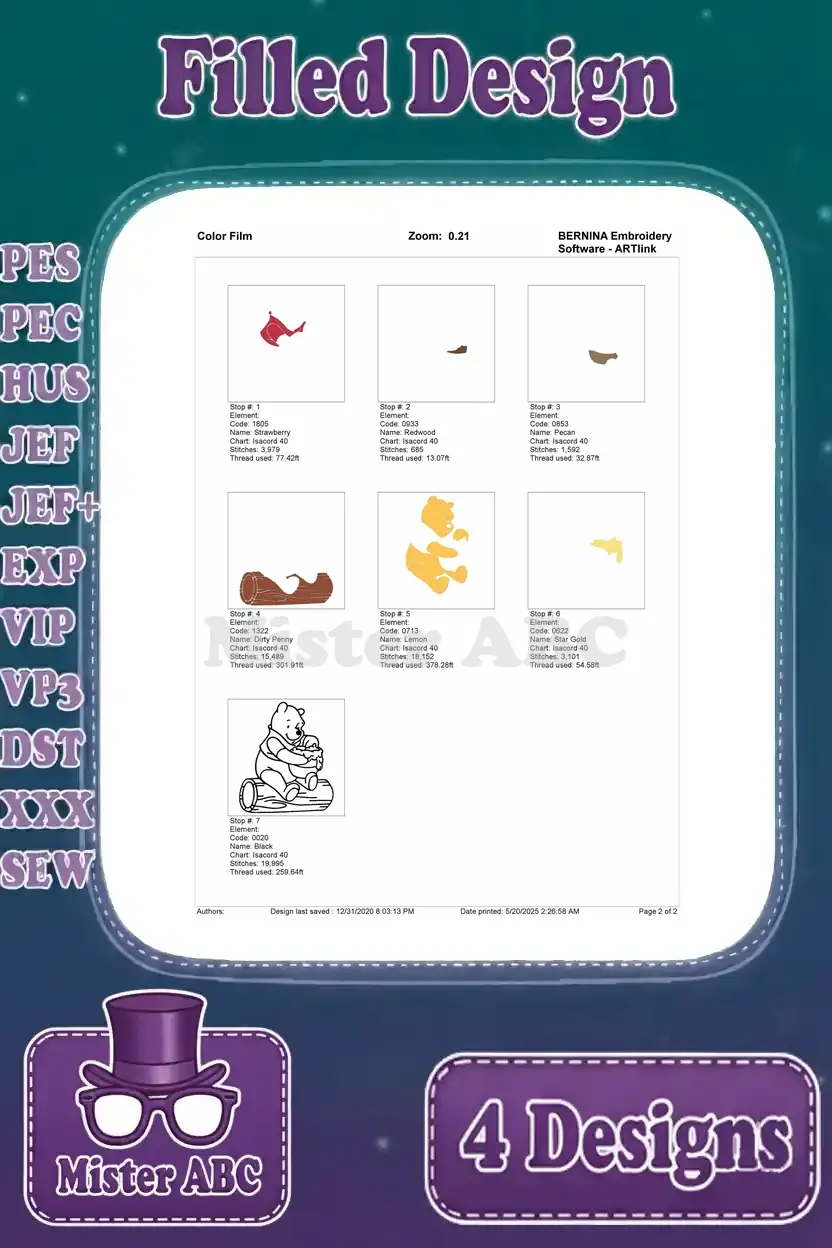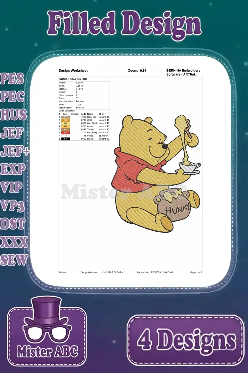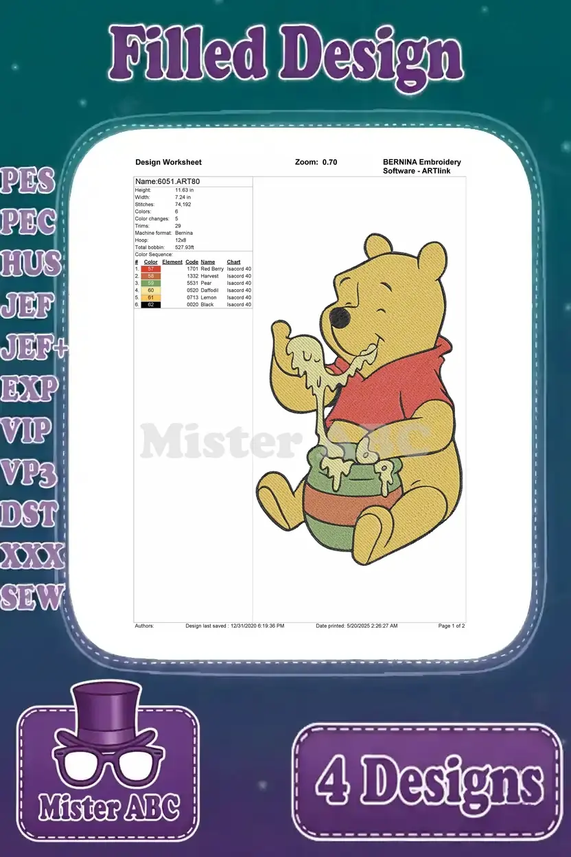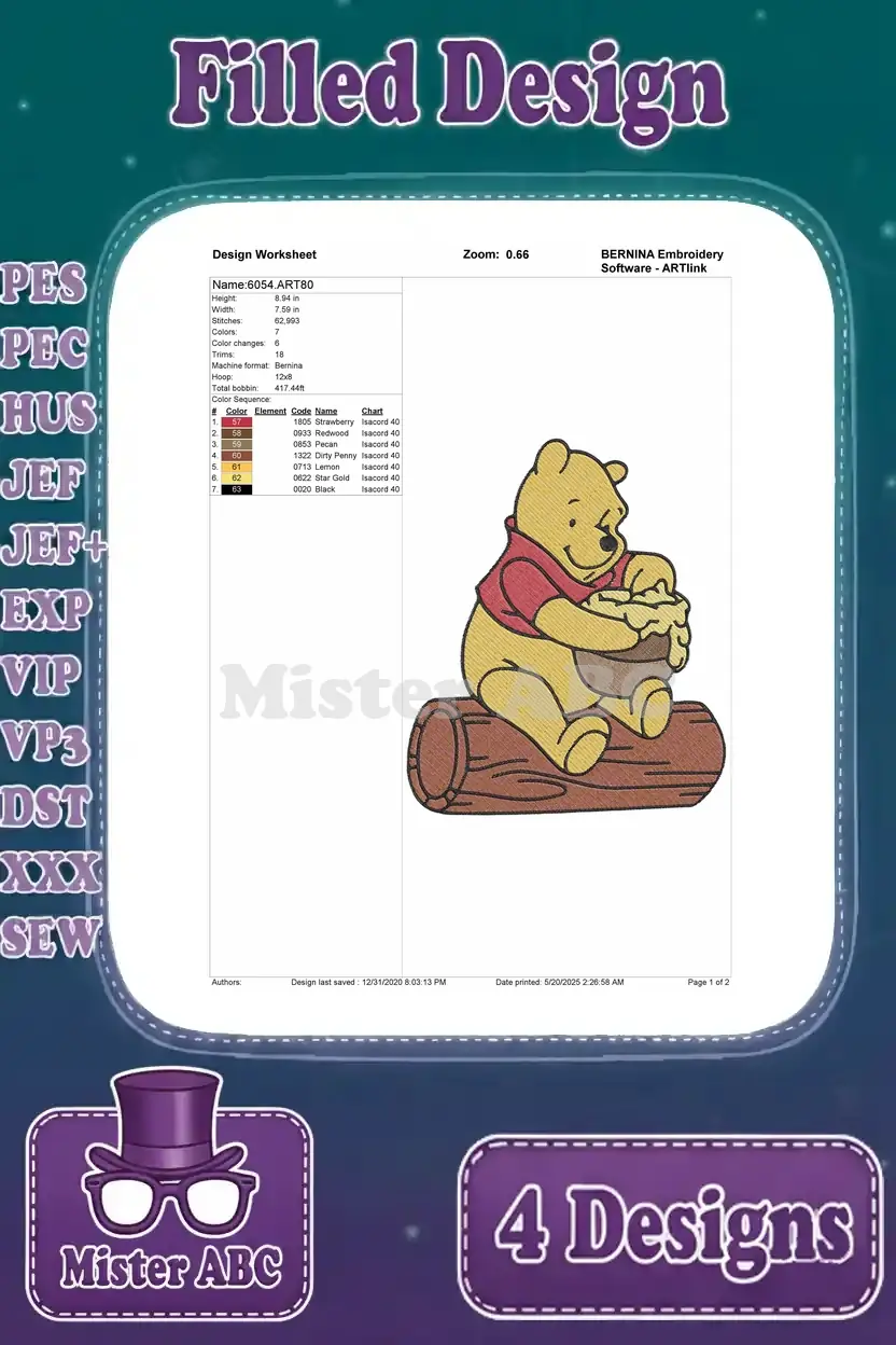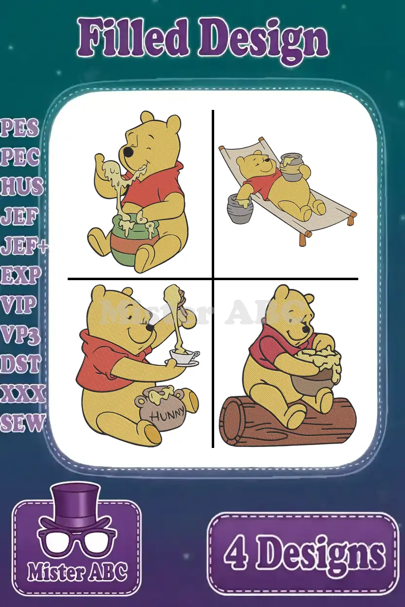 Delightful Winnie the Pooh filled embroidery designs! A charming 4-design bundle perfect for fans of the Hundred Acre Wood, adding a touch of sweetness to any project.