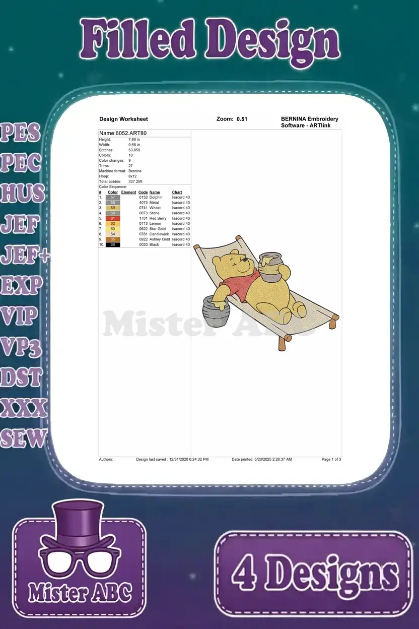 Winnie The Pooh Bear Relaxing On Lounger Eating Honey On Log With Flowers – Filled Embroidery Design – Instant Download