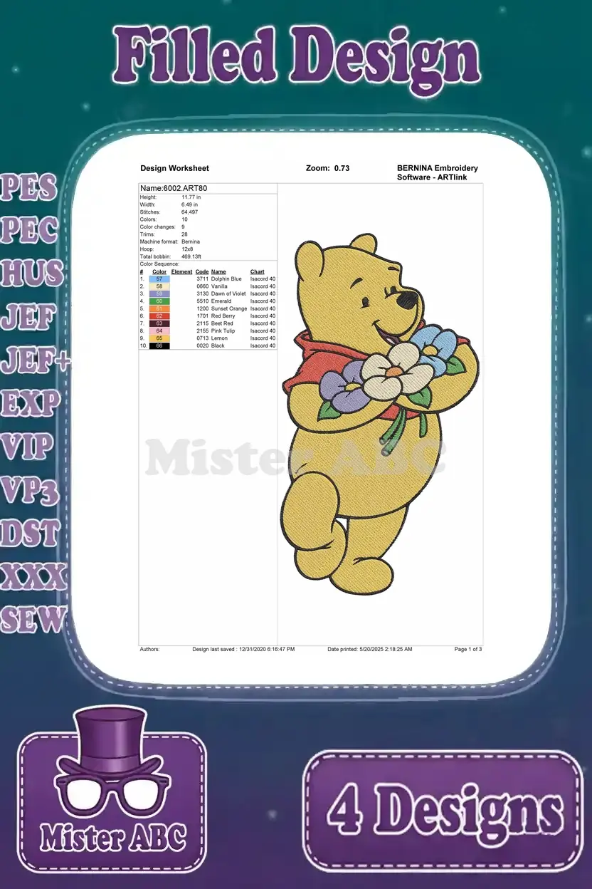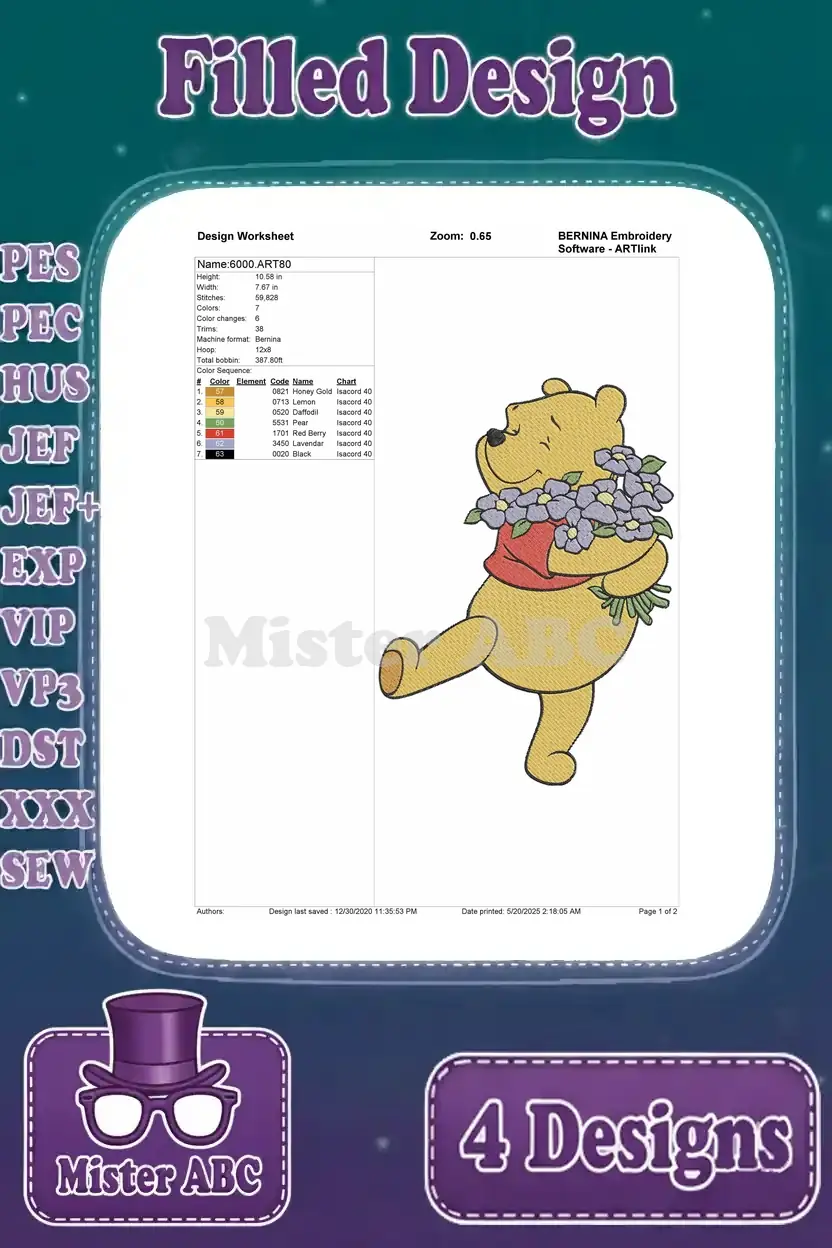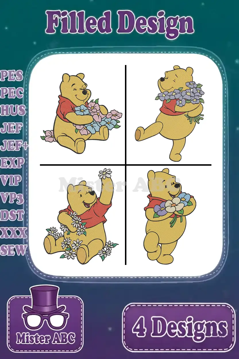 Winnie The Pooh Bear Sitting And Holding Various Flower Bouquets Collection – Filled Embroidery Design