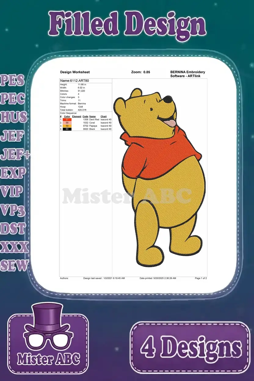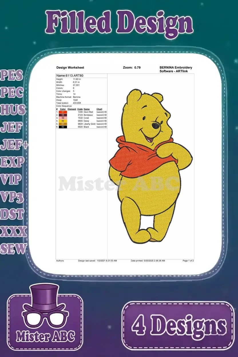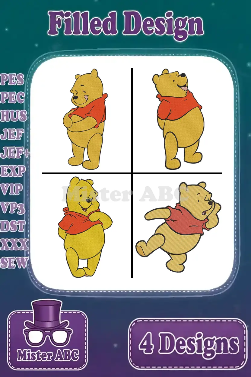 Winnie The Pooh Bear Various Classic Standing Sitting Waving And Dancing Poses – Filled Embroidery Design