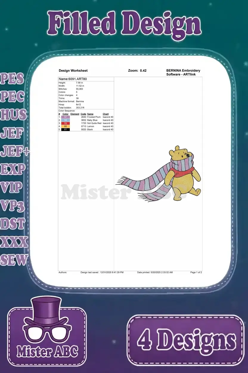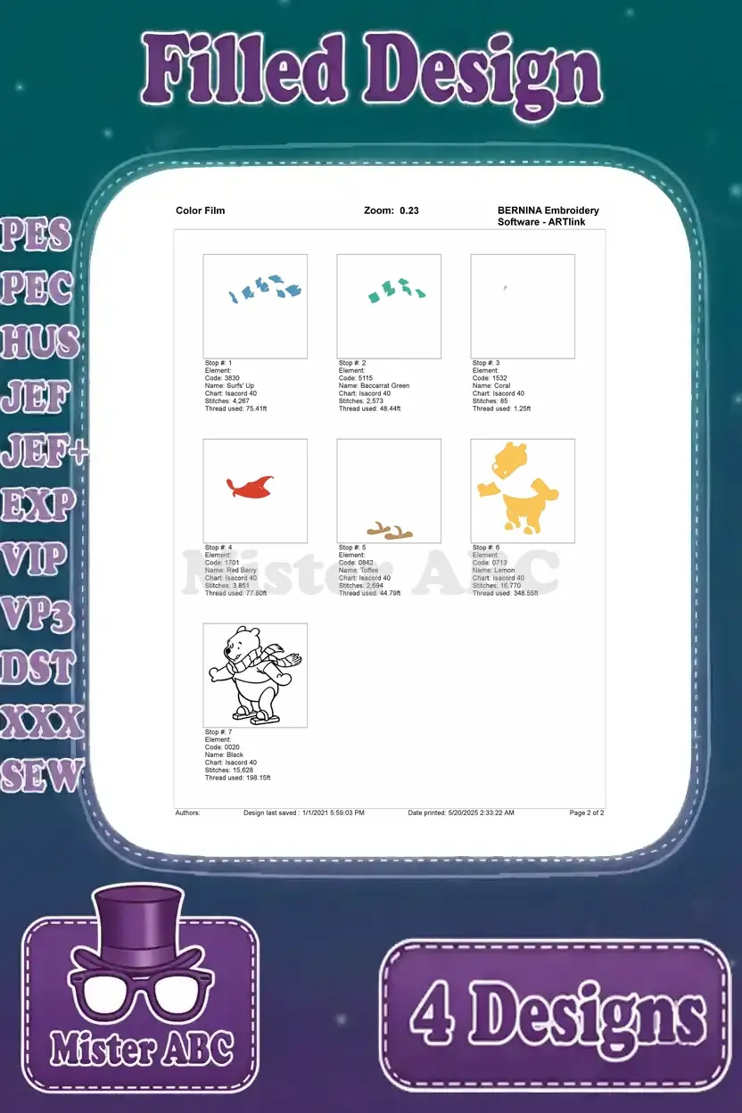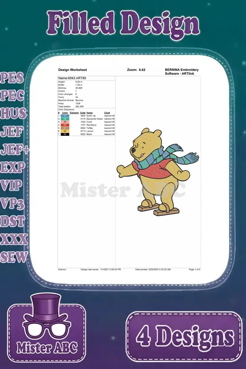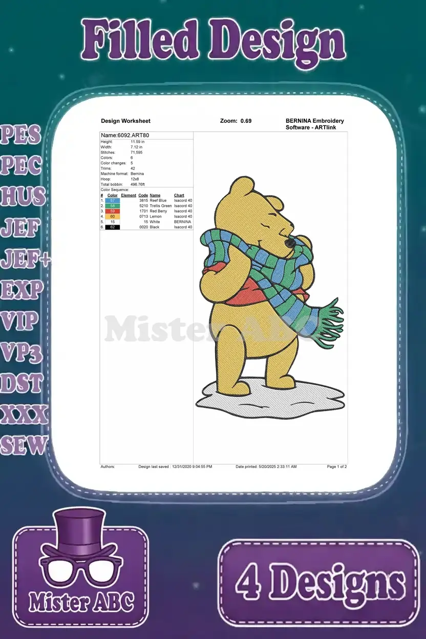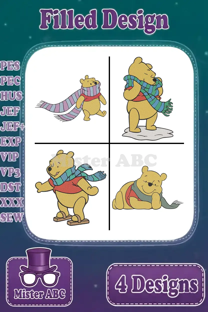Winnie The Pooh Bear Wearing Various Winter Scarves Long Blue And Red Green – Filled Embroidery Design