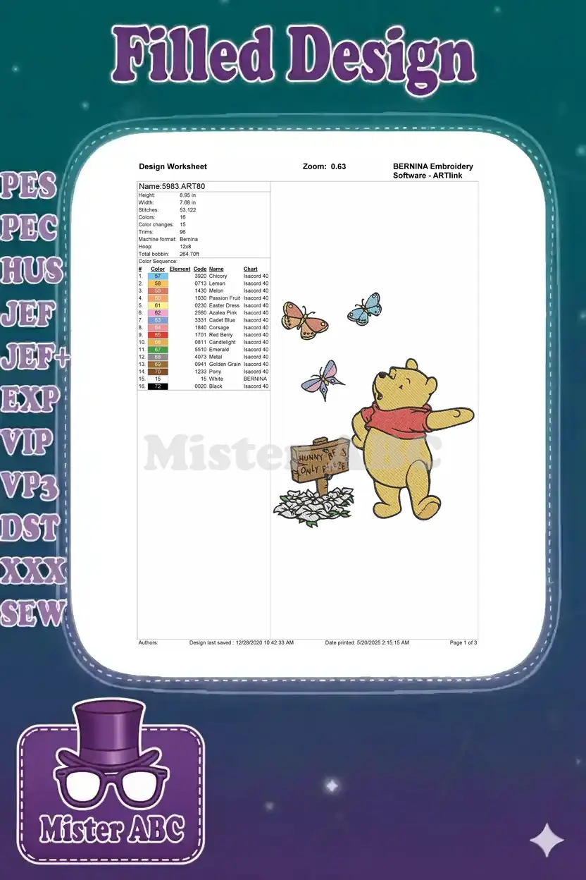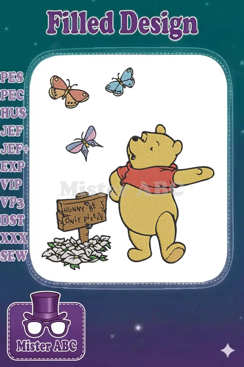 Winnie the Pooh with Butterflies and Hunny Sign Embroidery Designs