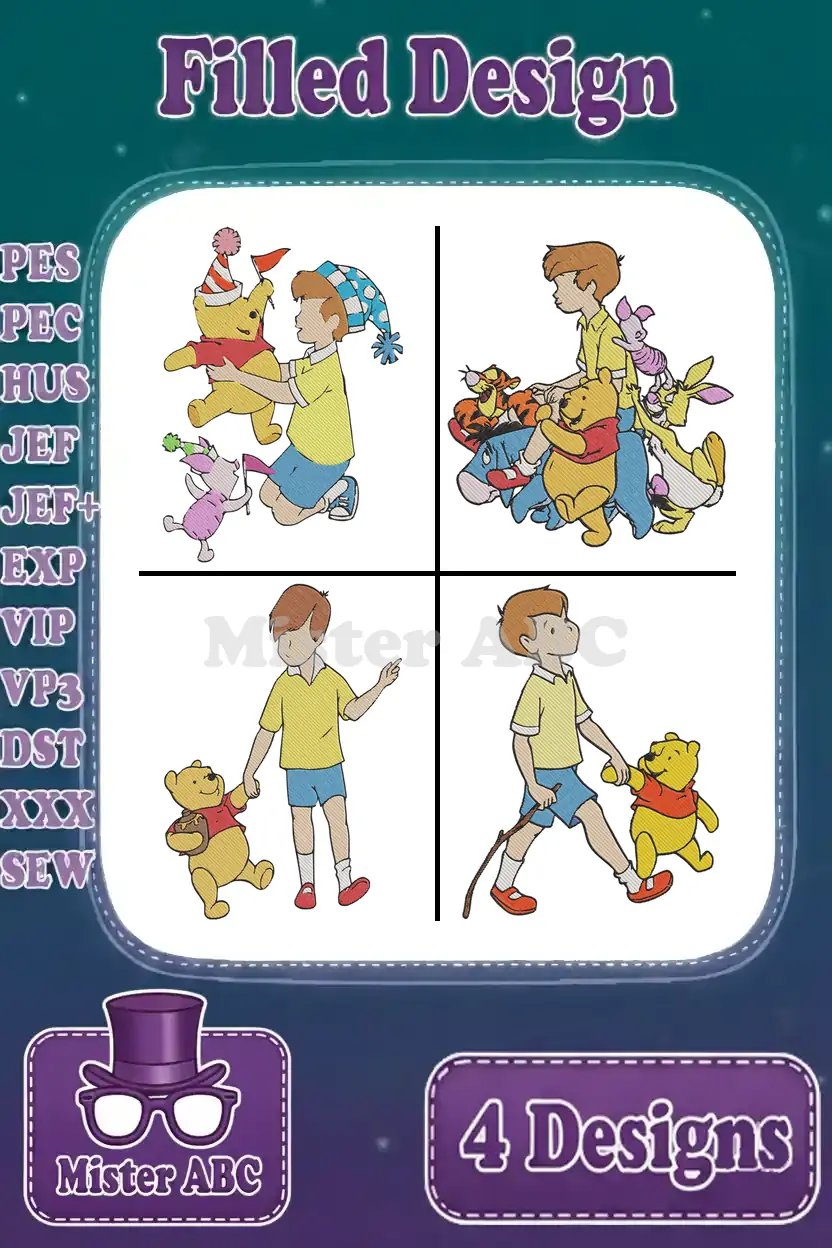Winnie The Pooh – Christopher Robin Playing With Pooh Piglet Tigger Eeyore – Hundred Acre Wood Friends Group – Filled Embroidery Design