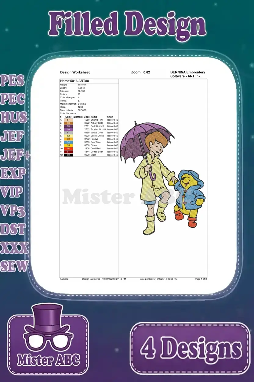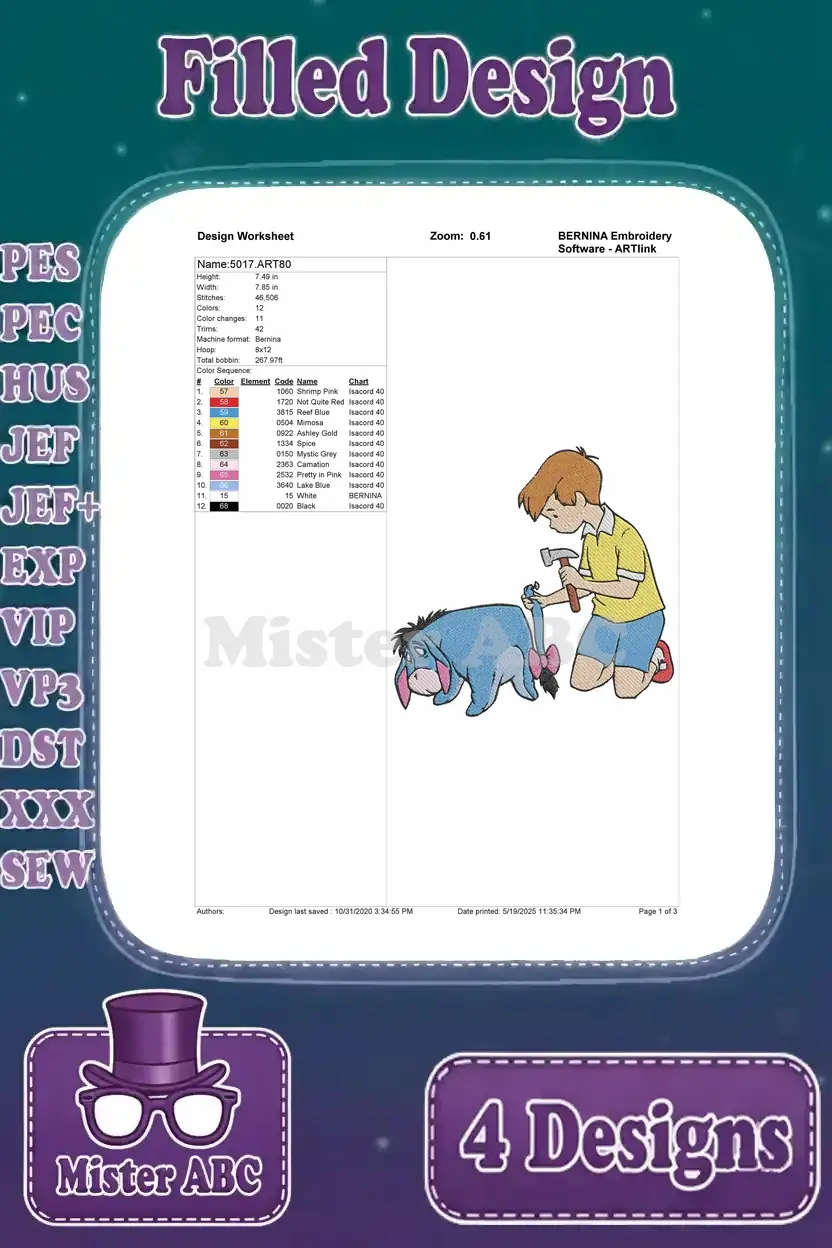 Winnie The Pooh – Christopher Robin With Pooh Balloon Eeyore Umbrella And Guitar – Playful Boy Adventures – Filled Embroidery Design