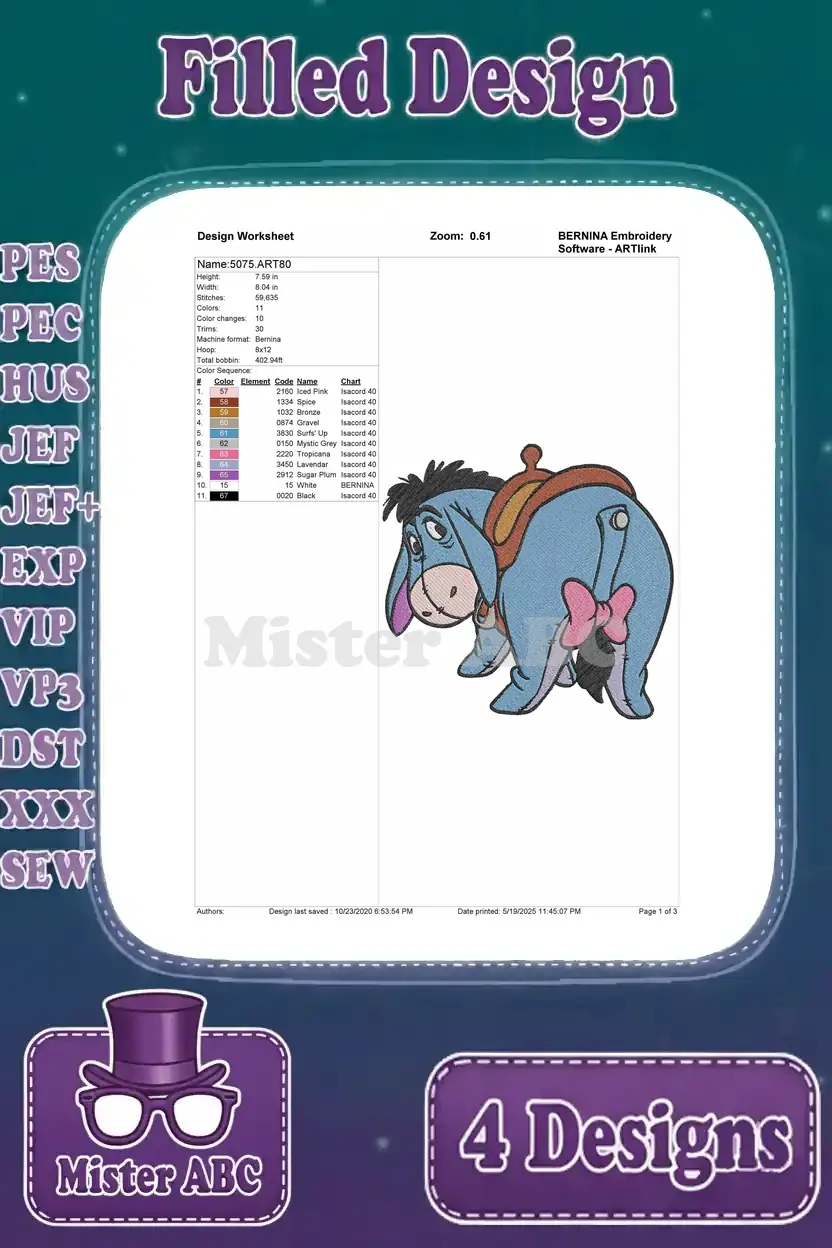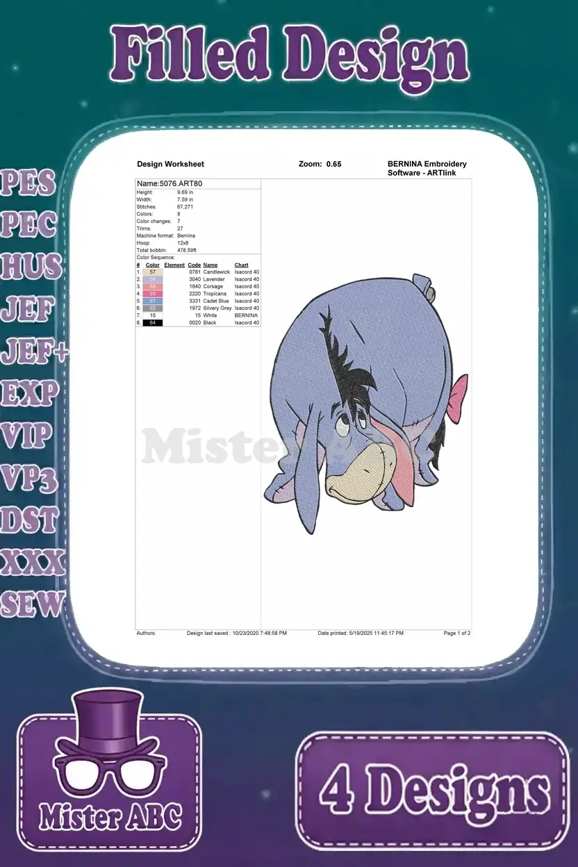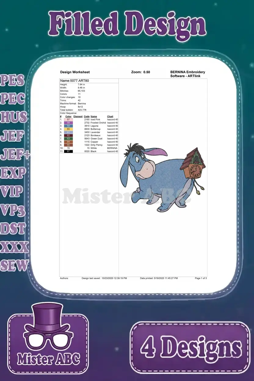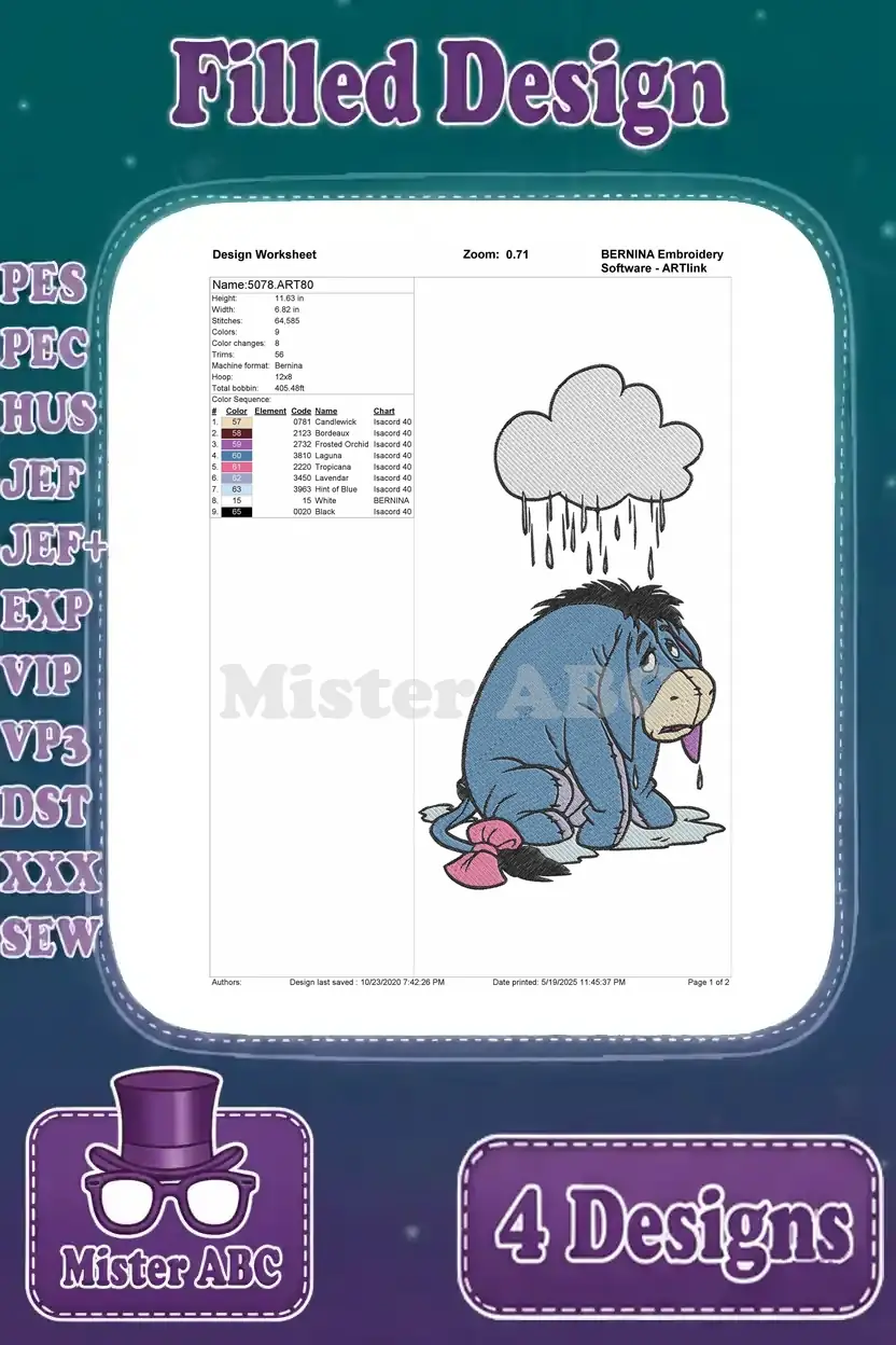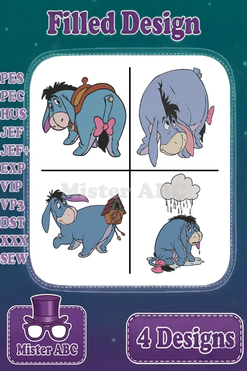Winnie The Pooh – Eeyore With Birdhouse On Head And Under Rain Cloud – Melancholy Donkey Moments – Filled Embroidery Design
