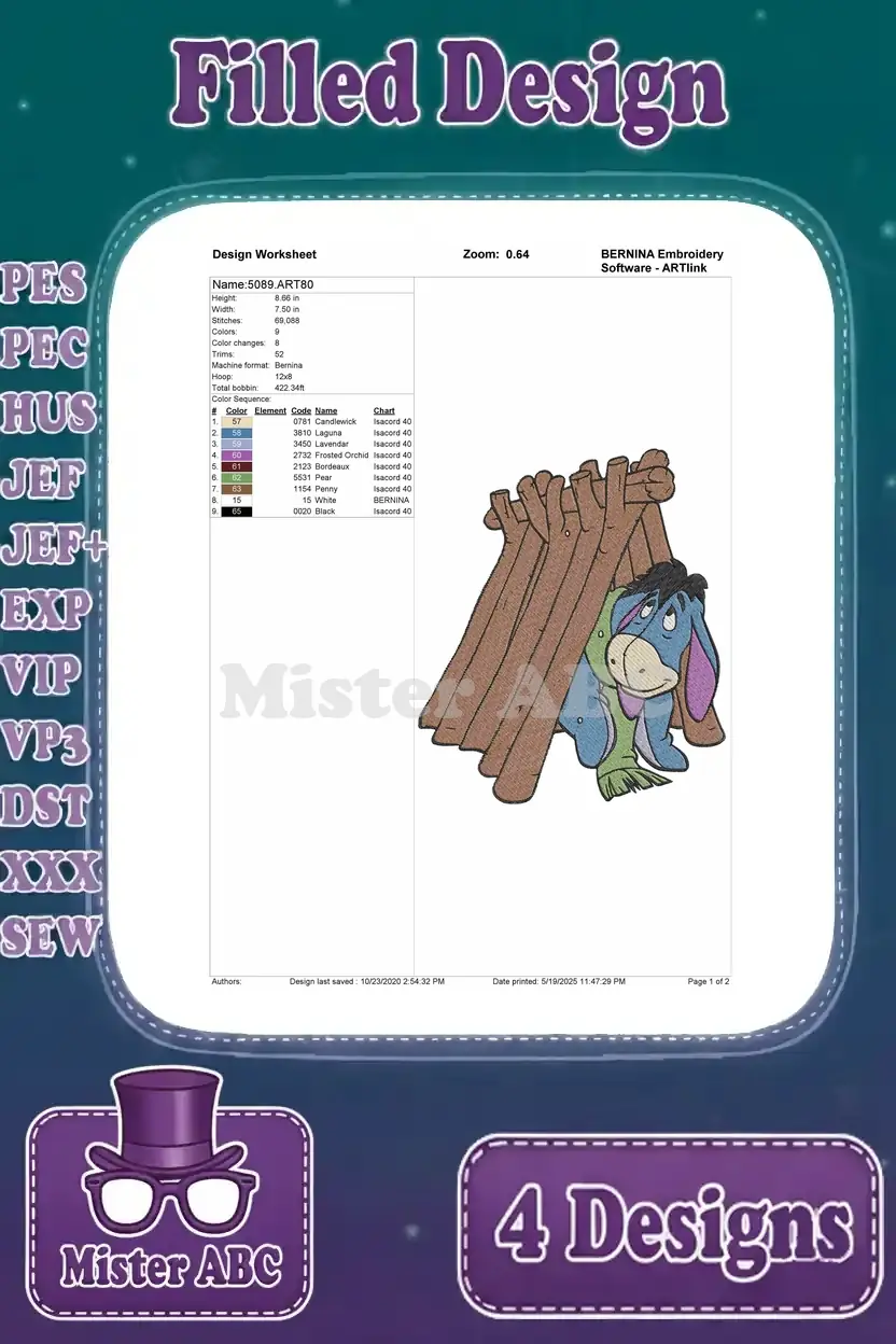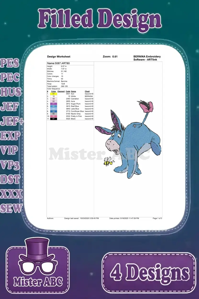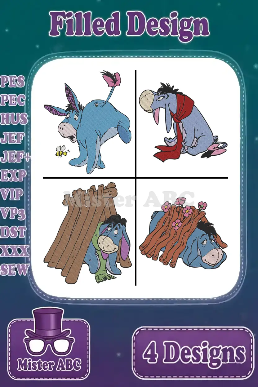 Winnie The Pooh – Eeyore Dancing With Flower And Red Scarf – Building His Stick House – Cute Donkey – Filled Embroidery Design