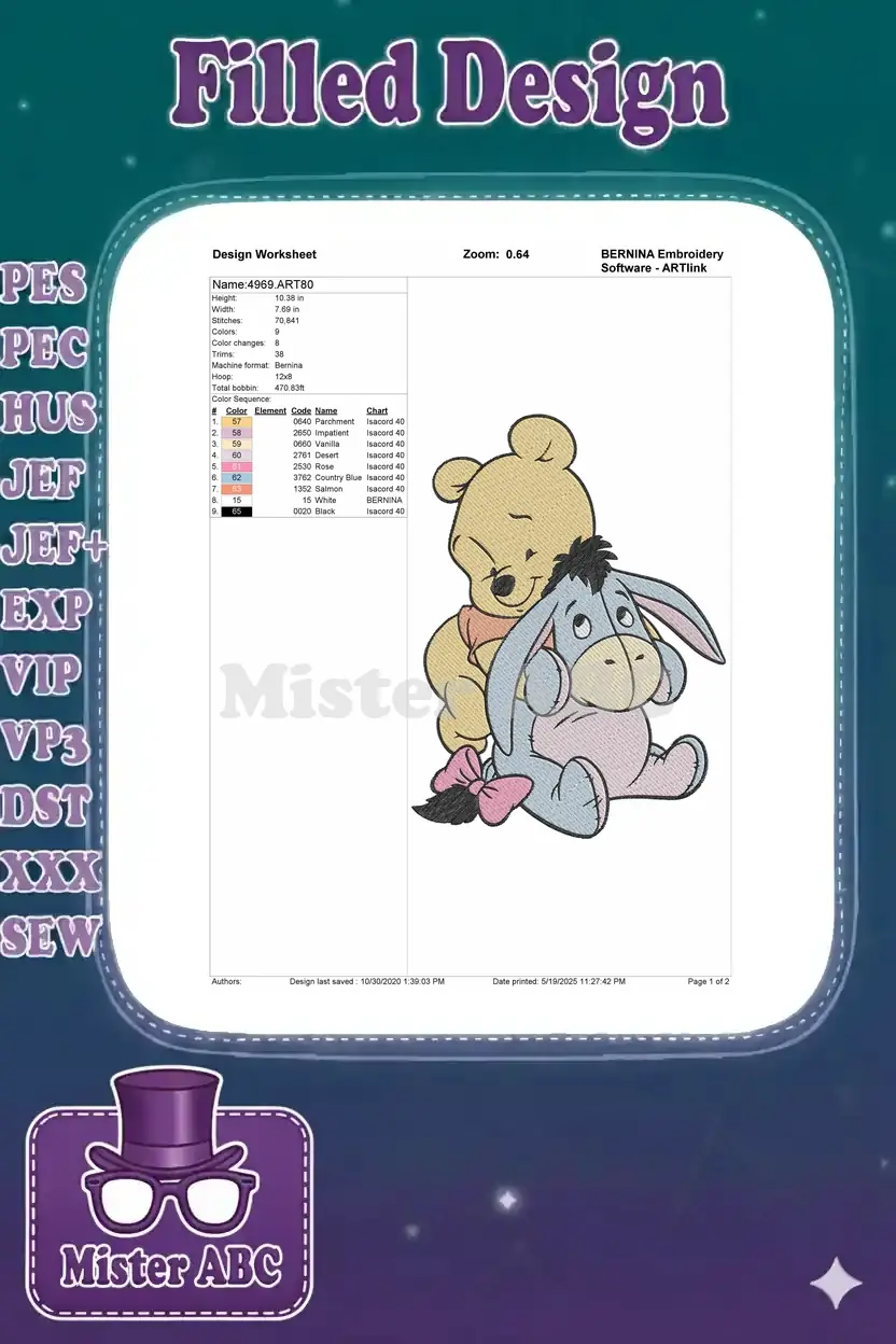 Embrace the warmth with this delightful embroidery of Winnie the Pooh hugging Eeyore, a heartwarming design perfect for any project. Bring joy!