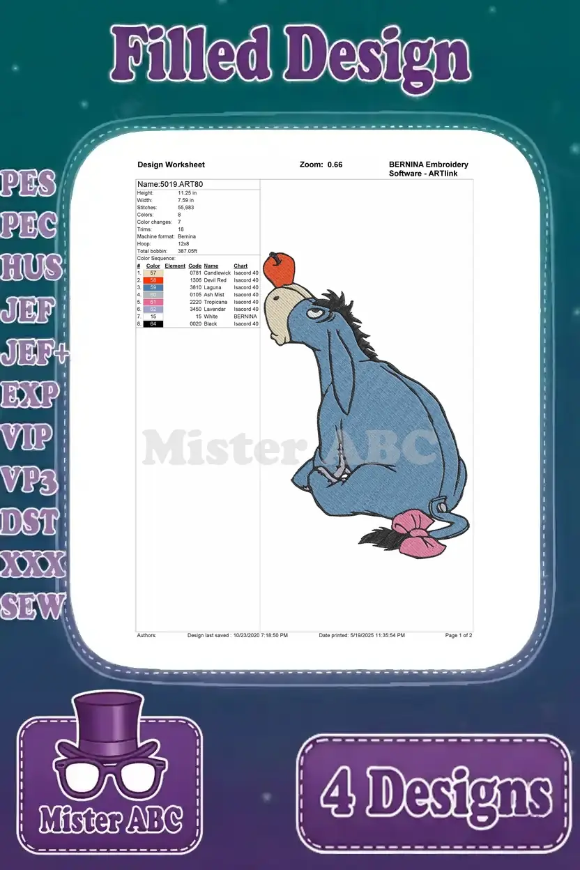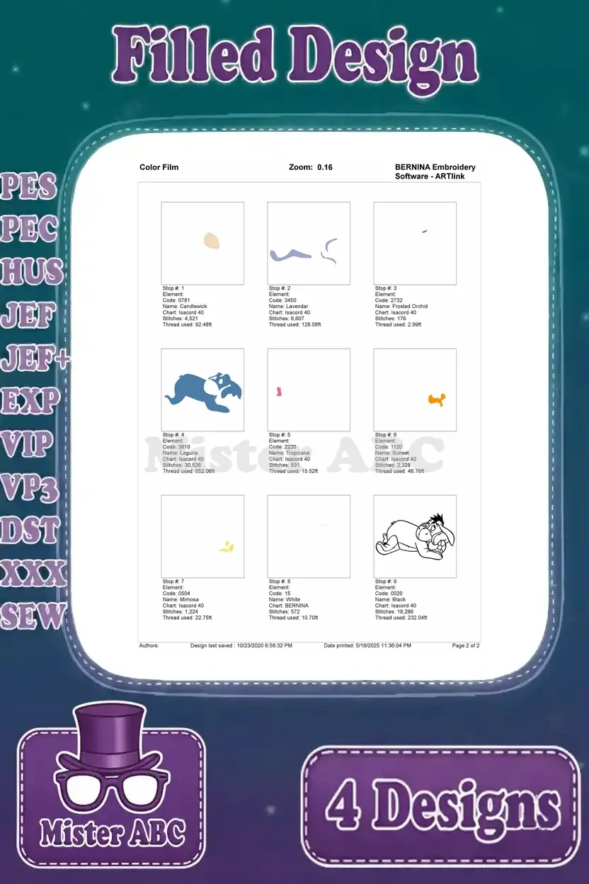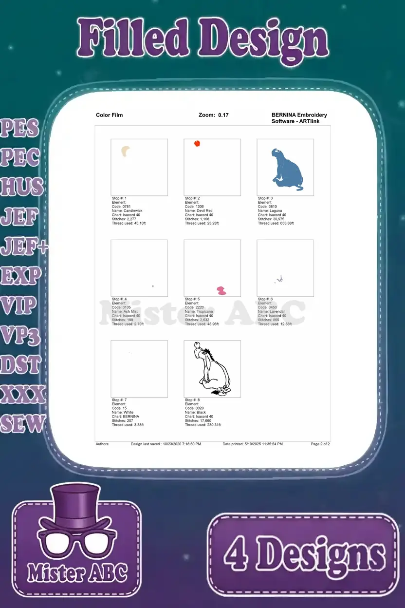 Delightful Eeyore embroidery bundle featuring four charming filled designs for your machine embroidery projects. Perfect for fans!