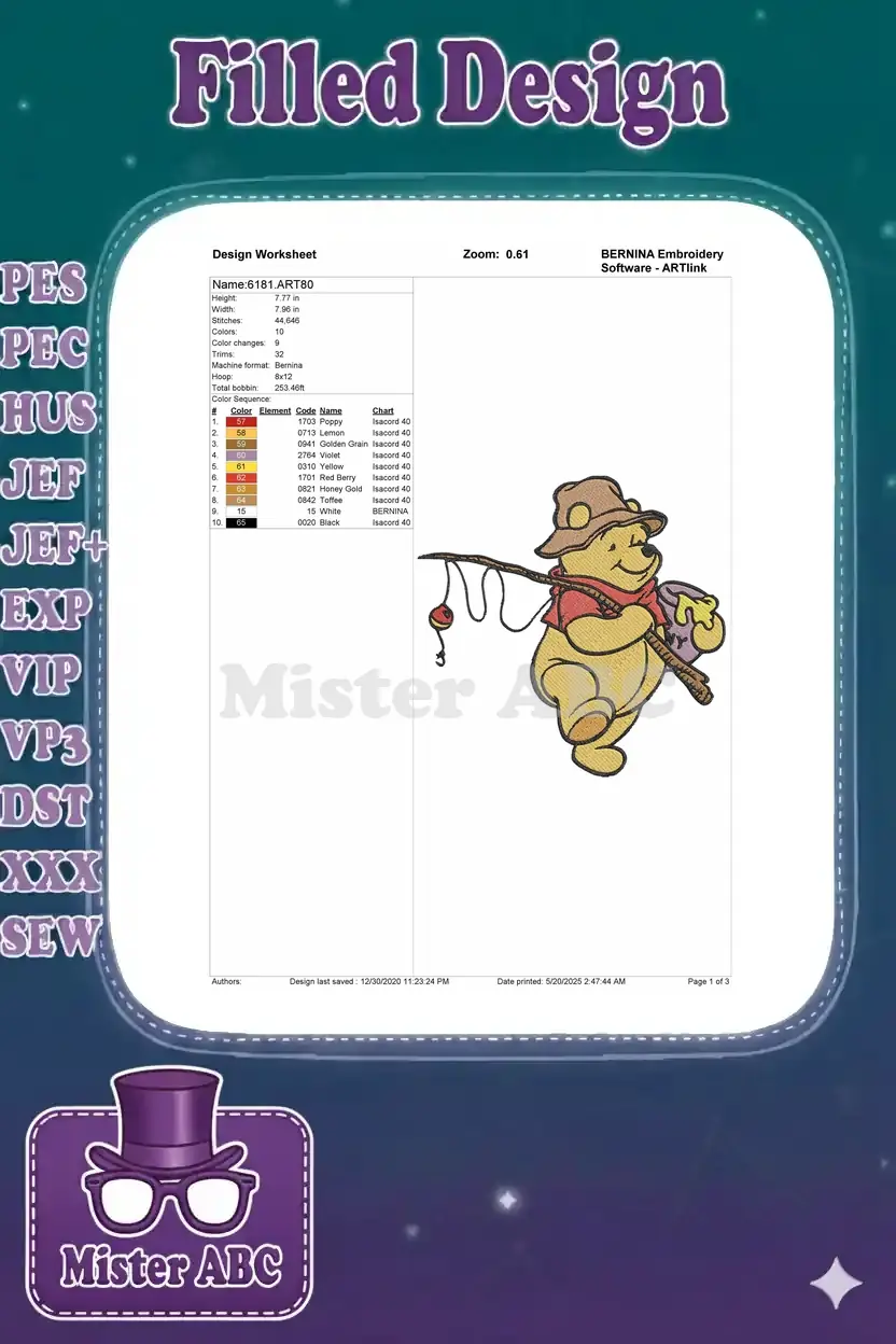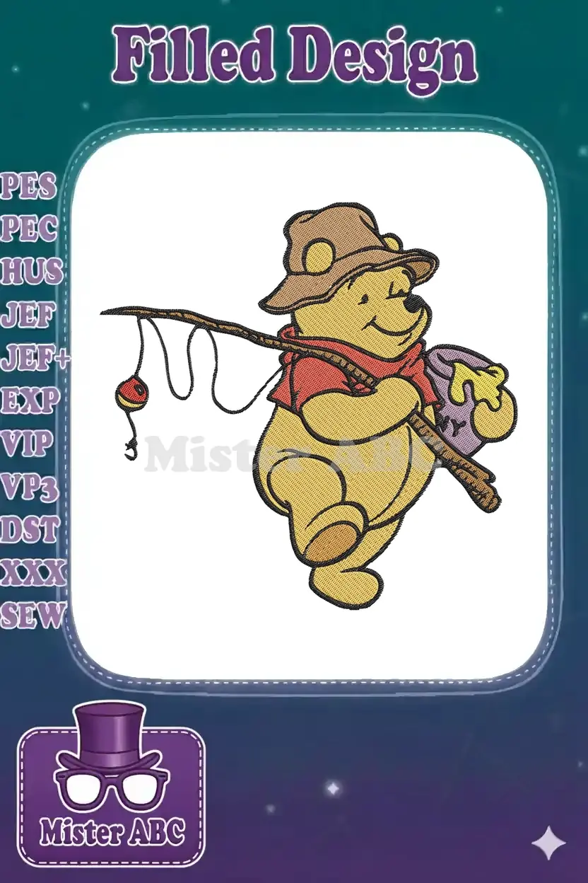 Whimsical Winnie the Pooh embroidery design, showcasing Pooh Bear fishing with his beloved honey pot. Perfect for fans.