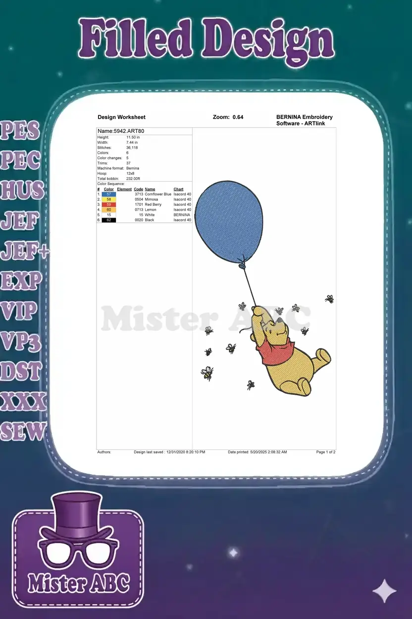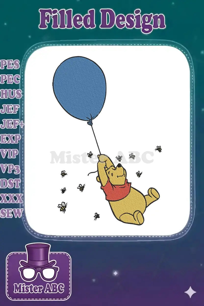 Winnie the Pooh floating blue balloon with bees embroidery designs