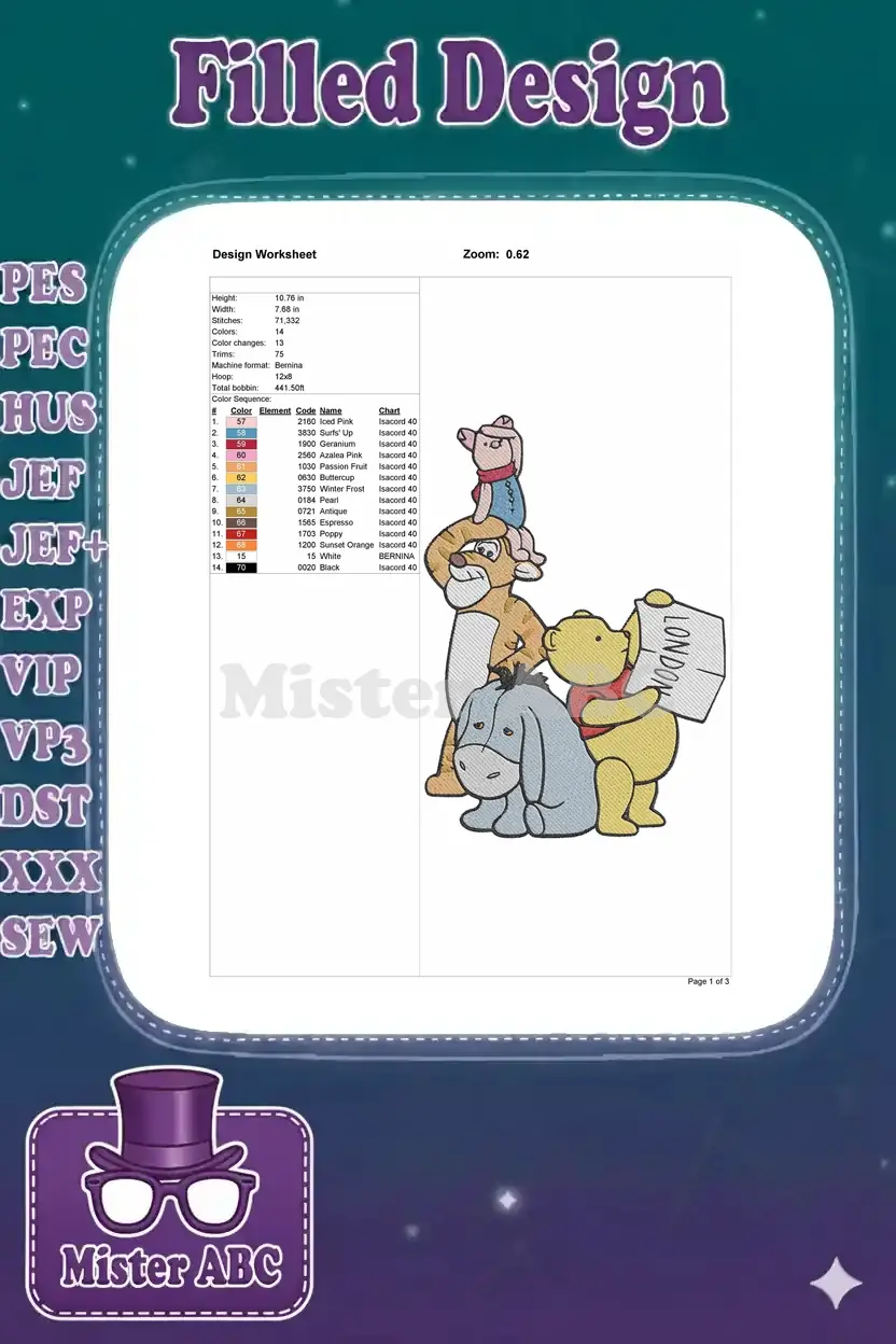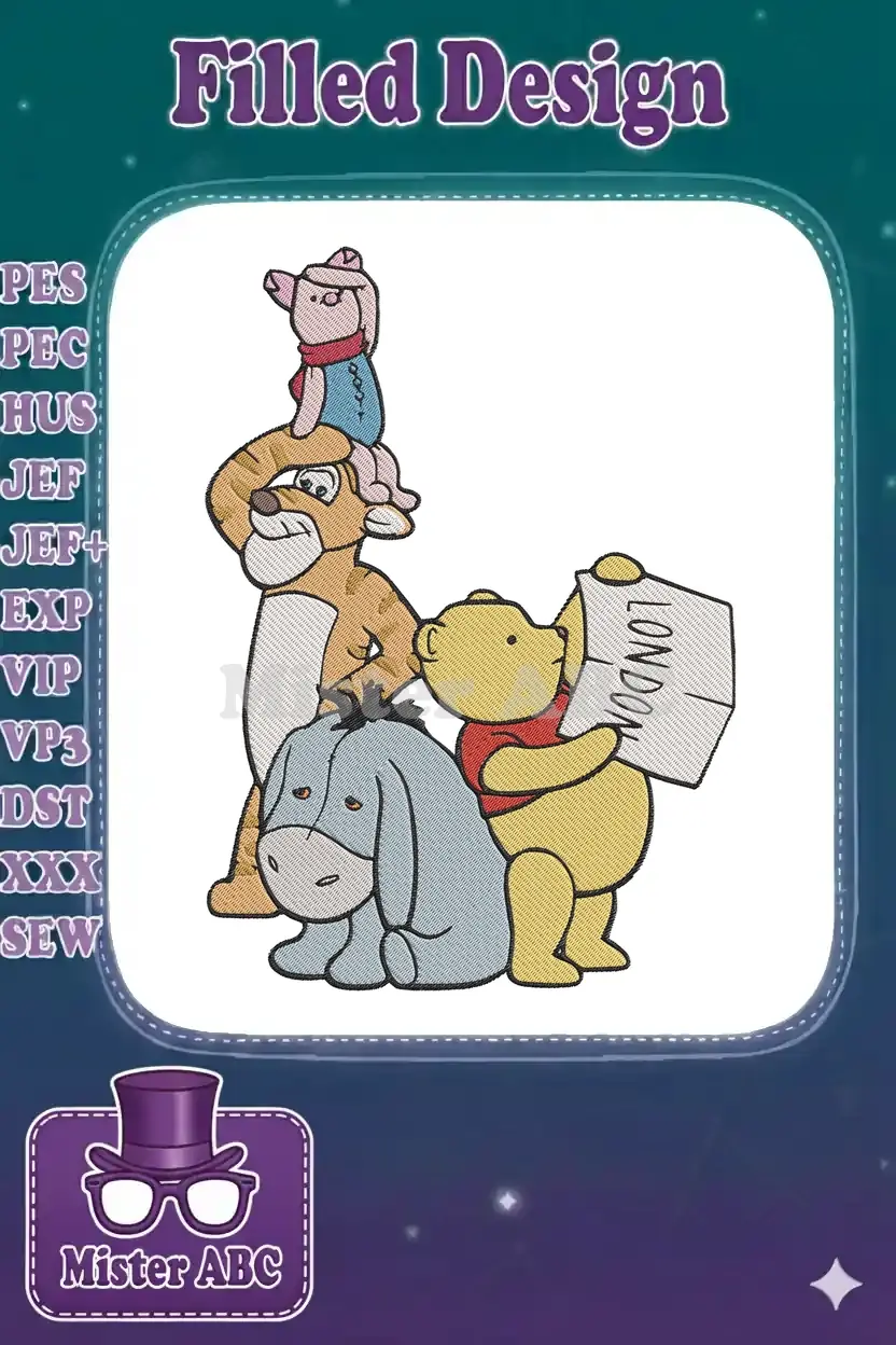 Charming Pooh and friends embroidery, perfect for adding adventure. Features Pooh, Piglet, Tigger, Eeyore on a London journey!