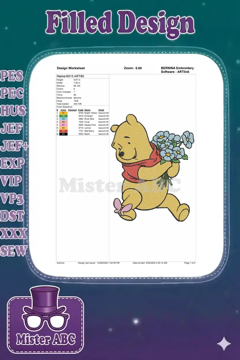 Winnie Pooh holding blue flowers embroidery designs with pink butterfly