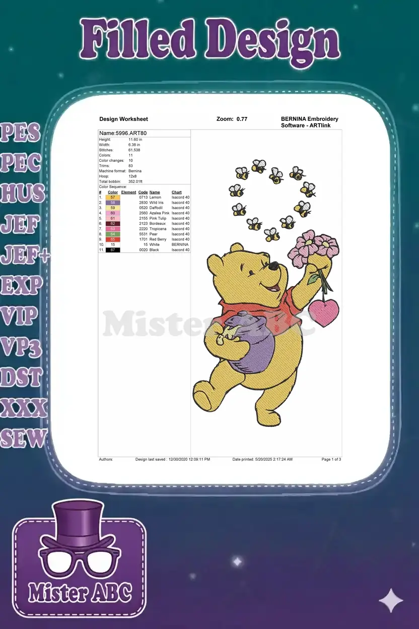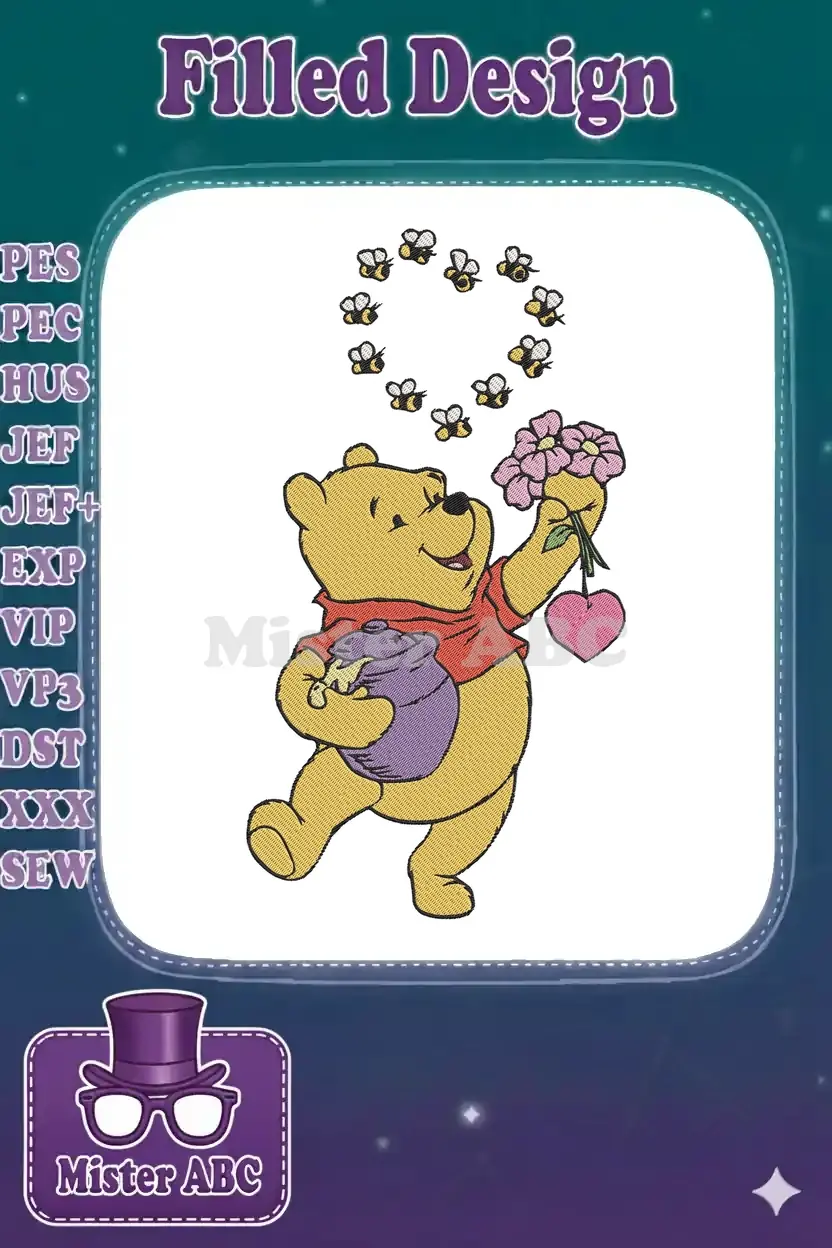 Winnie Pooh holding honey pot flowers bees heart embroidery designs