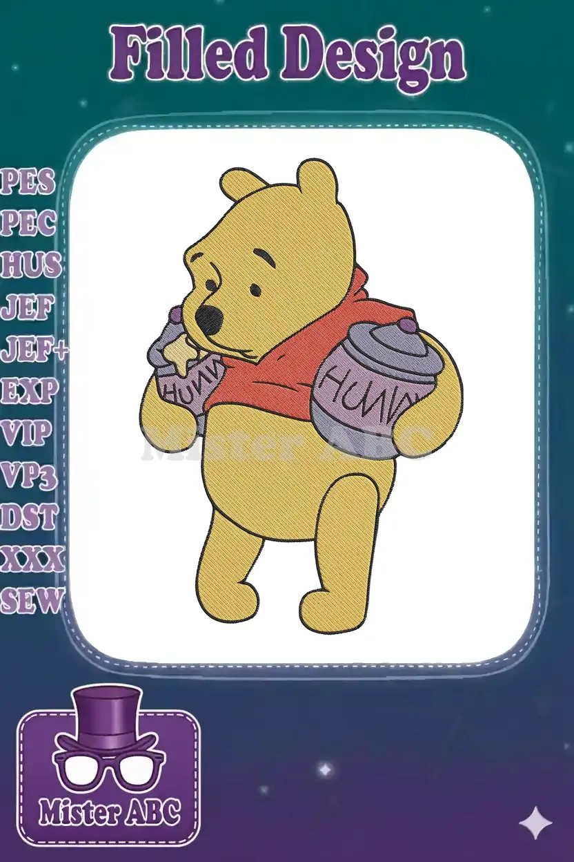 Delightful Winnie the Pooh embroidery design featuring him happily clutching two honey pots. A sweet addition for any project!