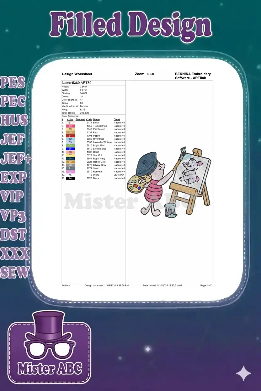 Captivating embroidery of Piglet as an artist, painting a charming elephant on an easel. Perfect for Disney fans and art lovers.