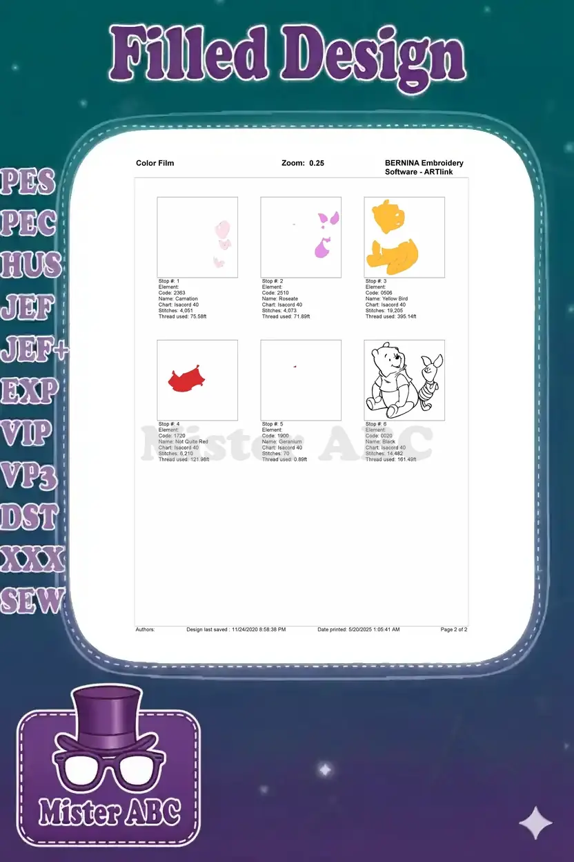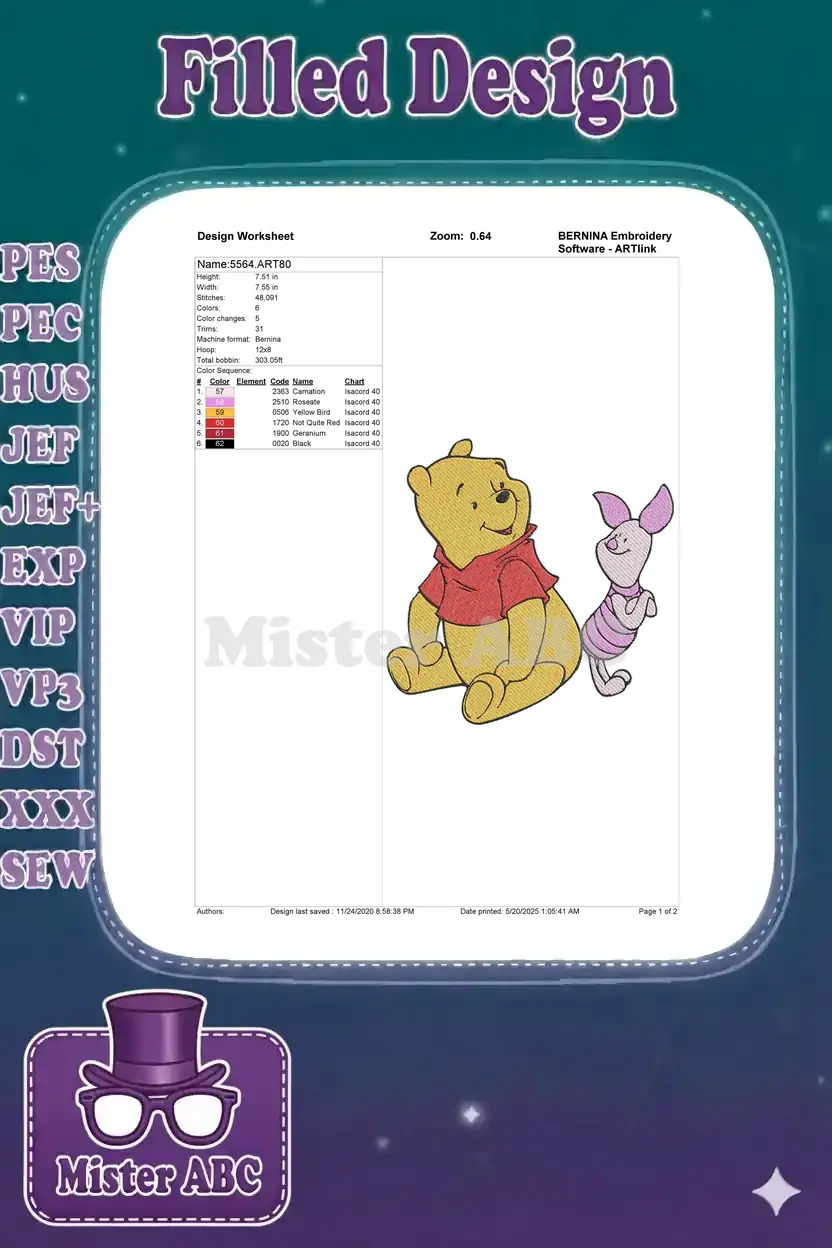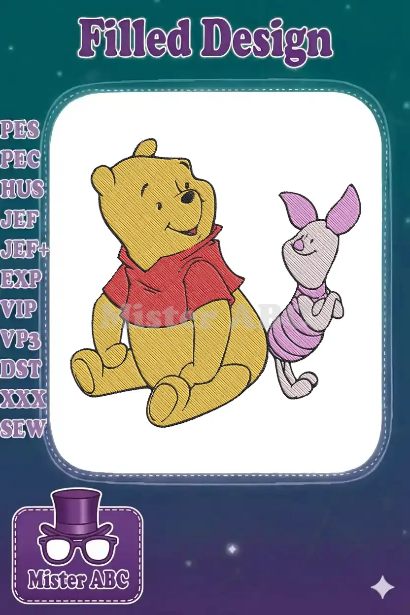 A heartwarming Winnie the Pooh and Piglet embroidery design, perfect for adding classic Disney charm to any project.