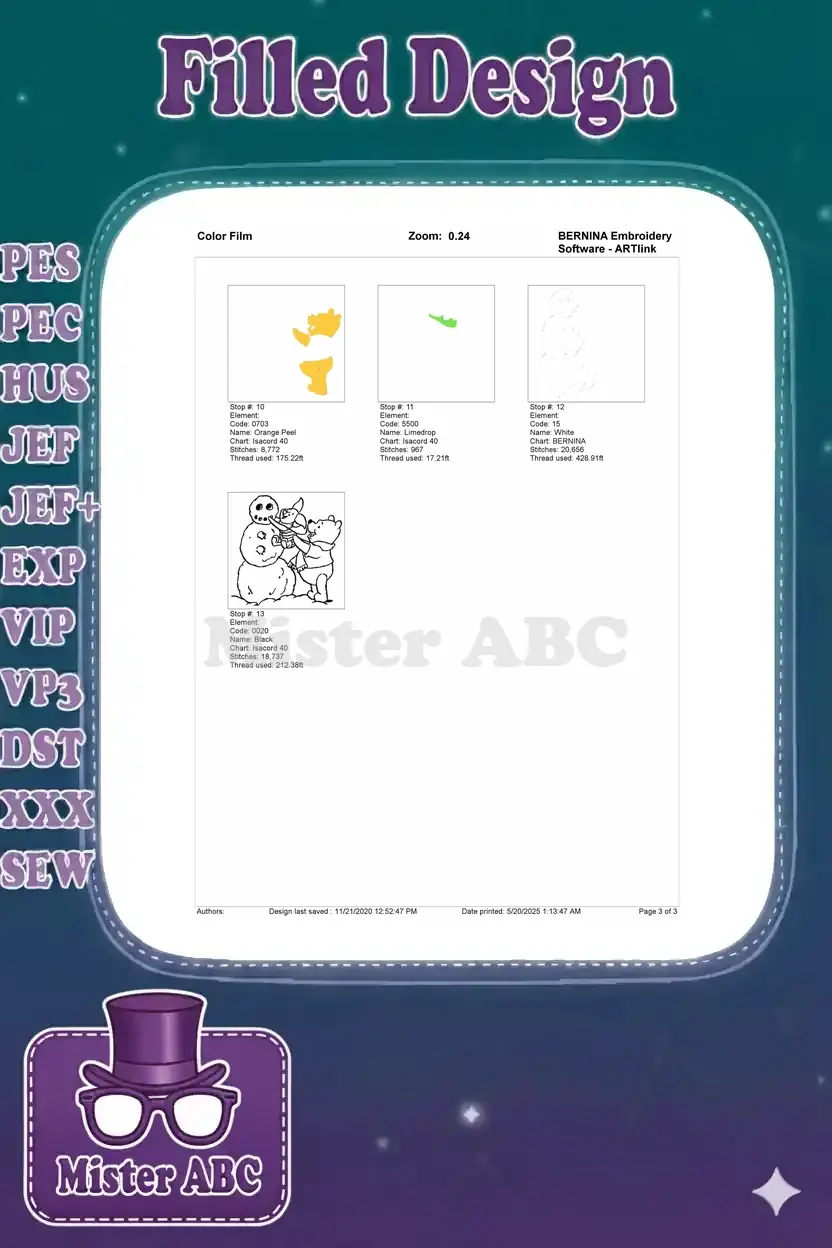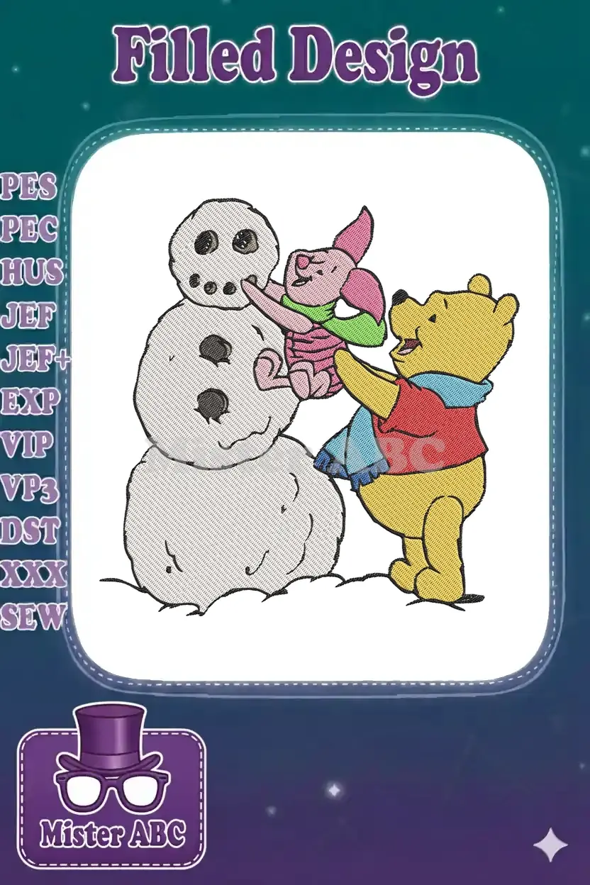 A charming embroidery design featuring Winnie the Pooh and Piglet joyfully building a snowman, perfect for winter projects.