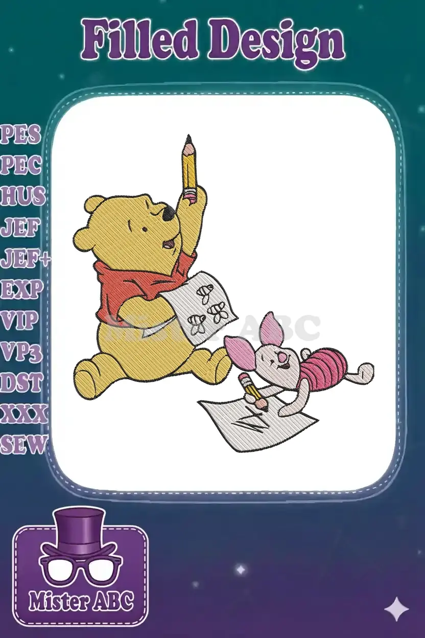 A charming embroidery design featuring Winnie the Pooh and Piglet joyfully drawing, perfect for children’s apparel and decor.