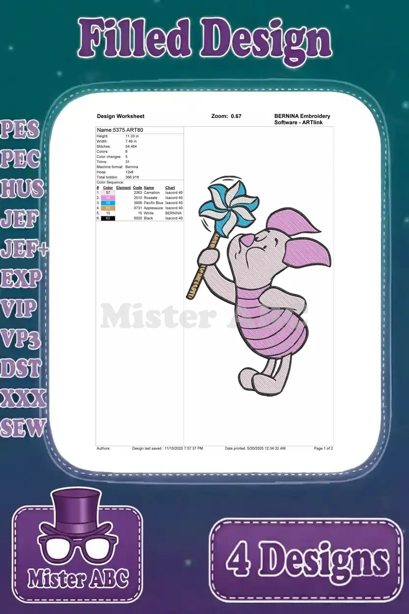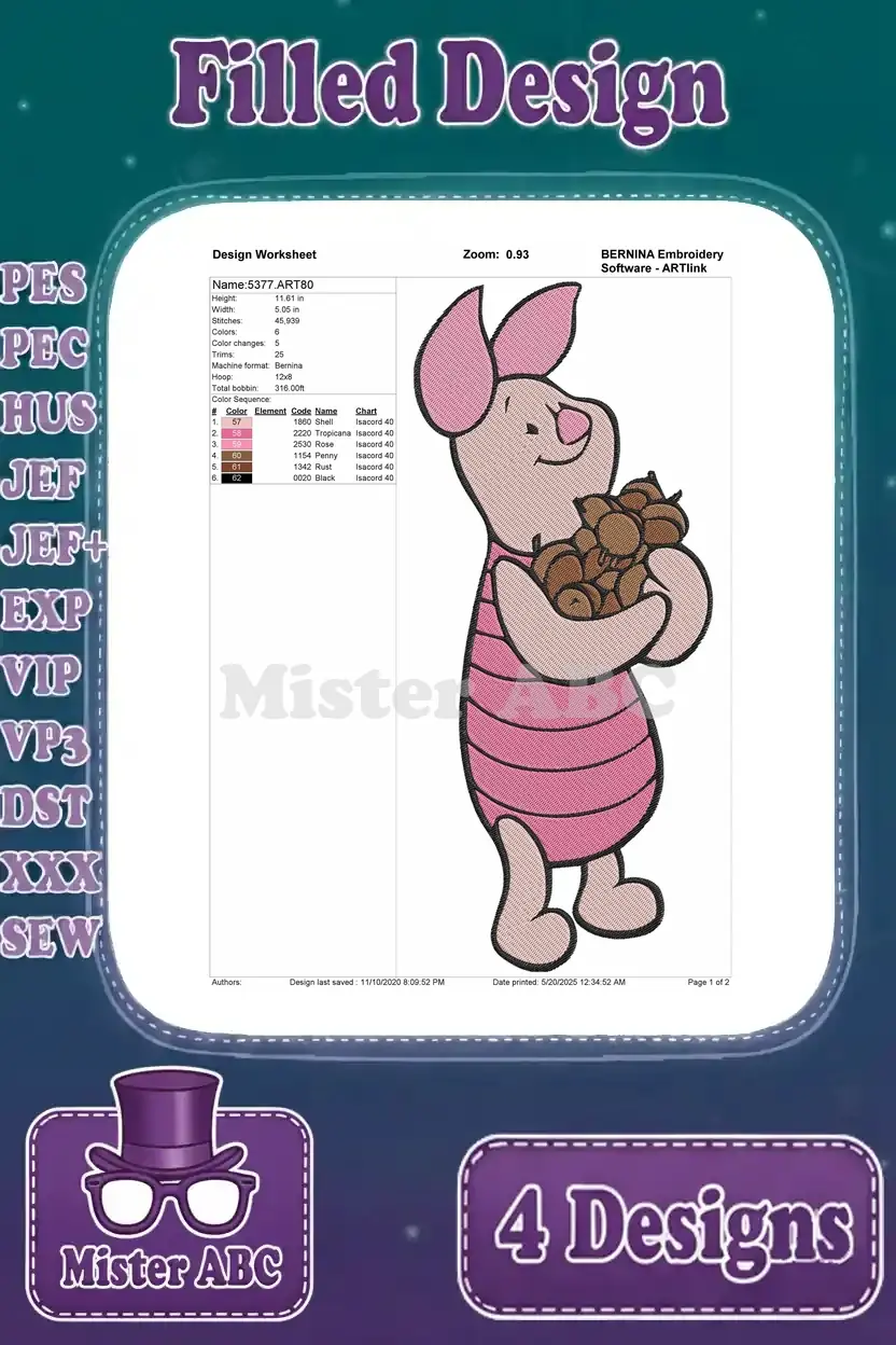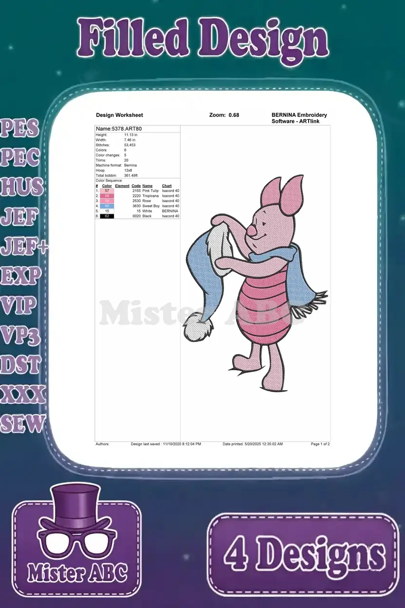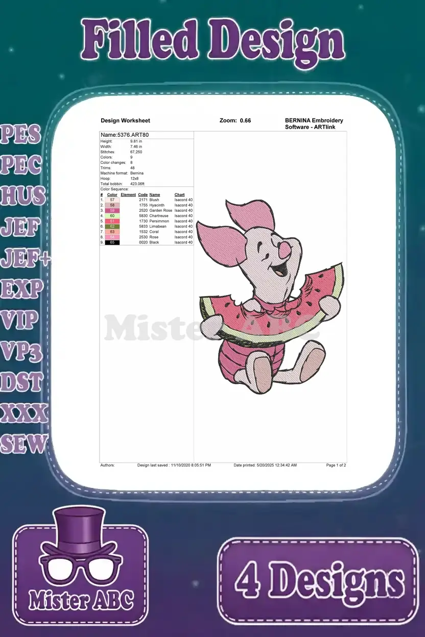 Winnie The Pooh – Piglet Enjoys His Treats – Snowflake Wand Watermelon Chocolate And Blue Hat – Hundred Acre Wood Cute – Filled Embroidery Design