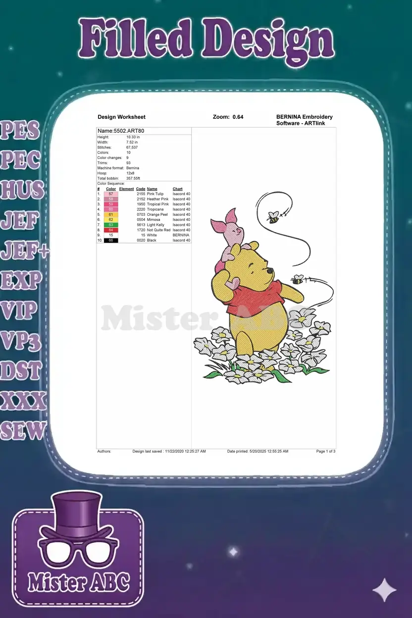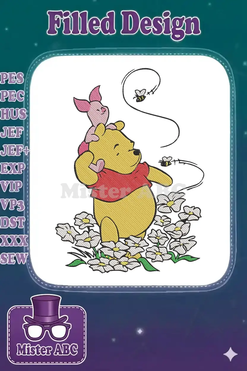 A delightful embroidery design featuring Winnie the Pooh and Piglet amidst beautiful flowers and playful bees. Perfect for adding a touch of whimsy and friendship to any project. Bring joy to apparel, decor, or gifts with this charming Disney-inspired artwork.