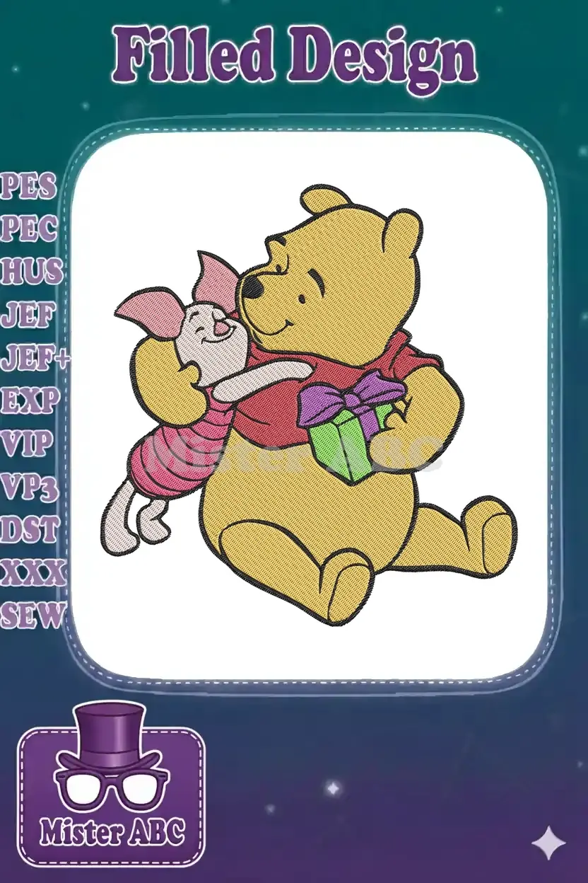 Winnie the Pooh and Piglet Hugging with Gift Embroidery Designs