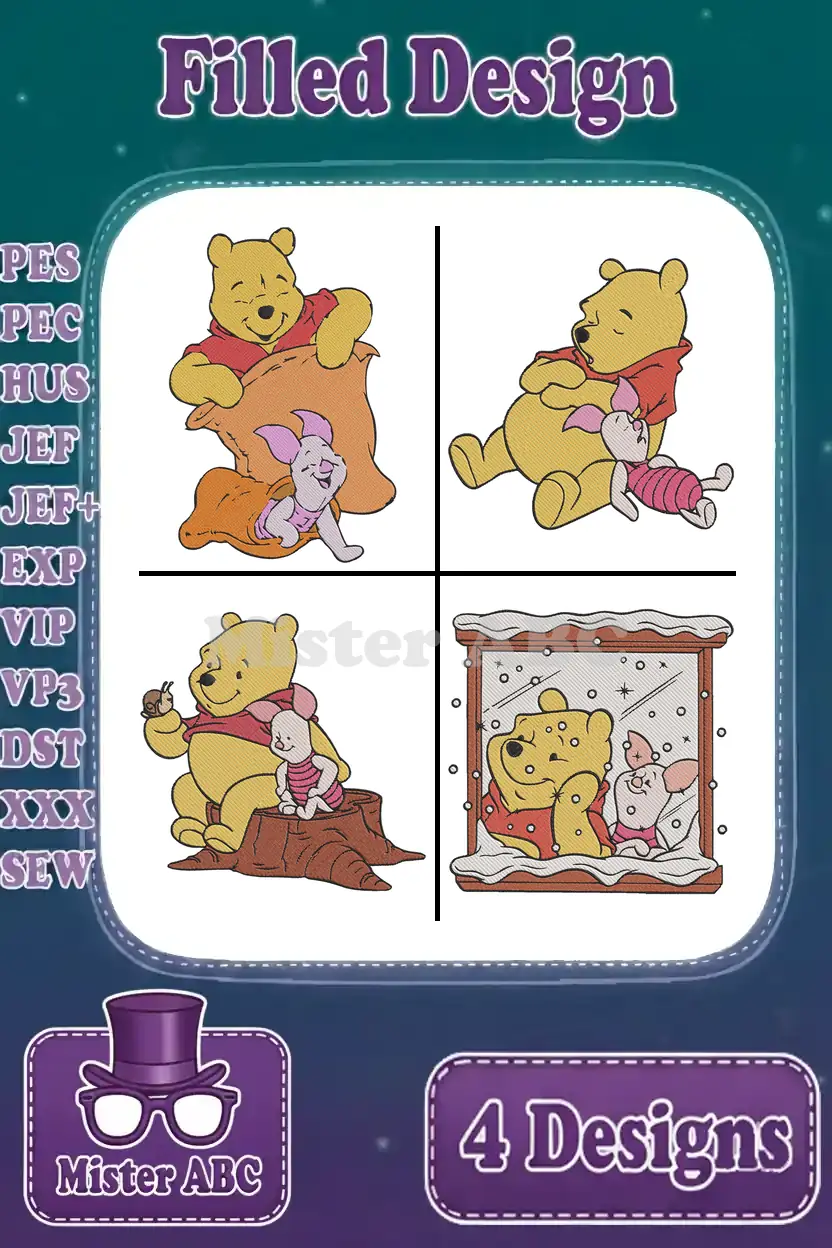 Winnie The Pooh And Piglet Hugging Winter Scarf And In Snow Globe Scenes – Filled Embroidery Design