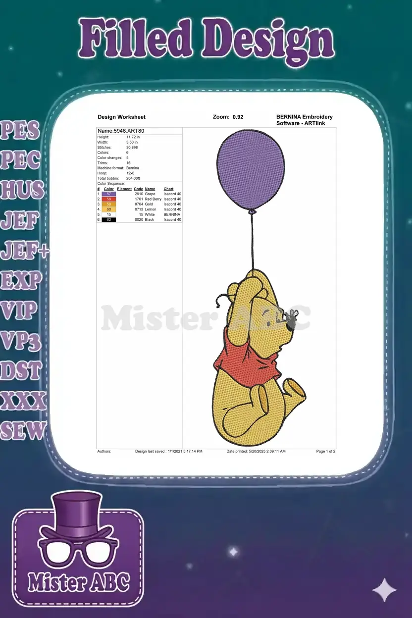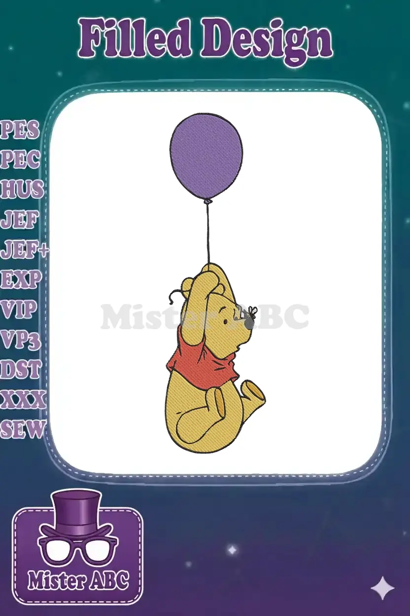 Winnie the Pooh with Purple Balloon and Bee Embroidery Designs