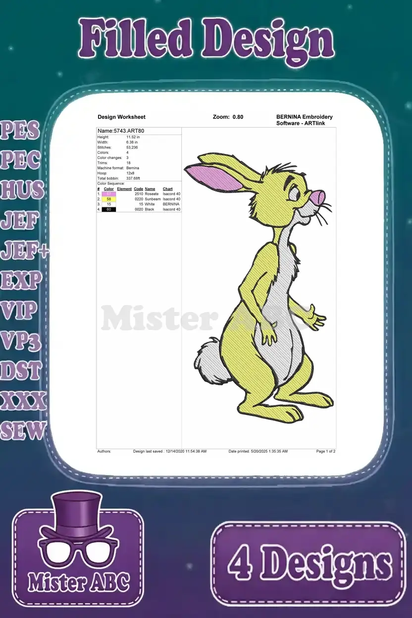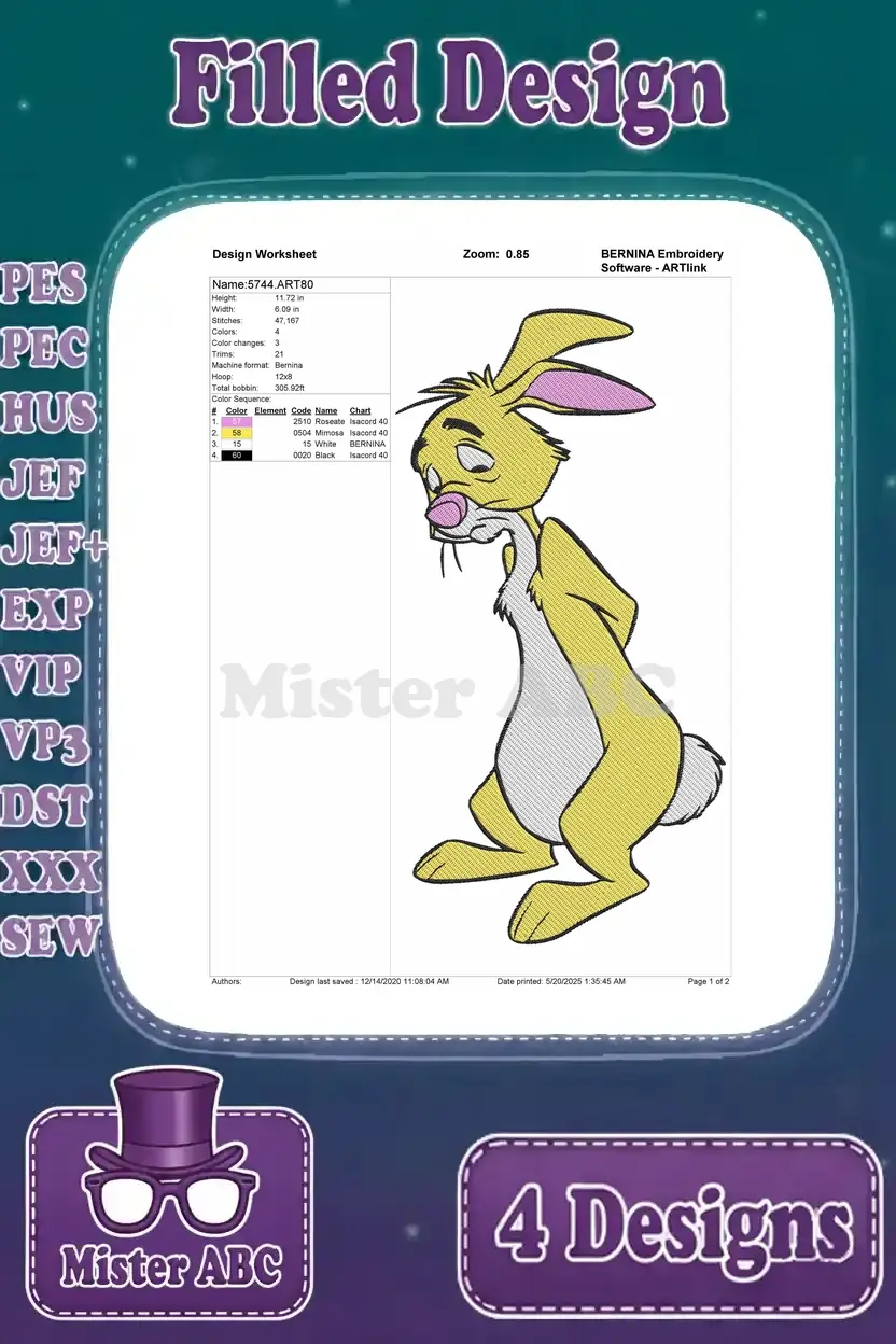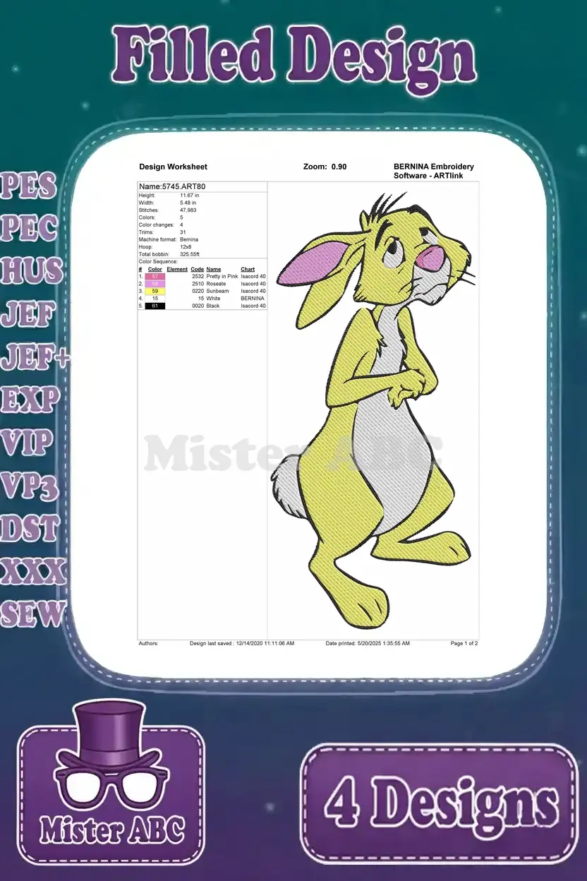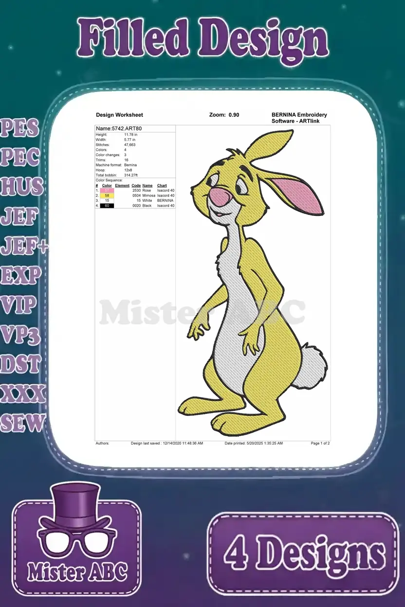 Delightful Rabbit embroidery design bundle featuring four unique, filled designs perfect for fans of classic animated characters.