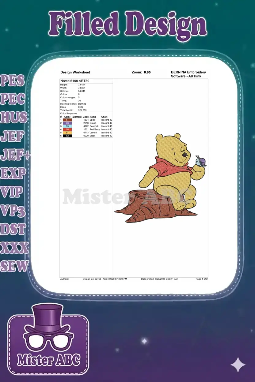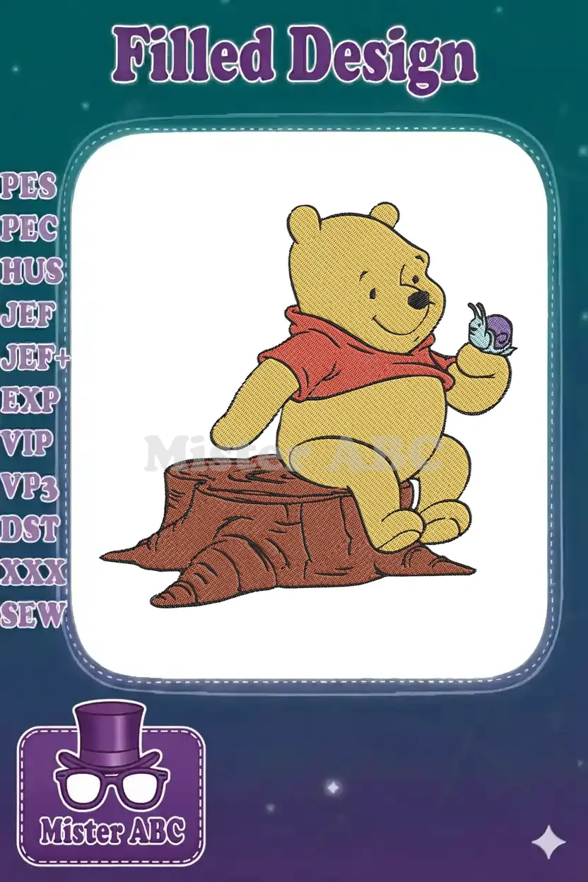 Winnie the Pooh sitting on tree stump holding snail embroidery designs